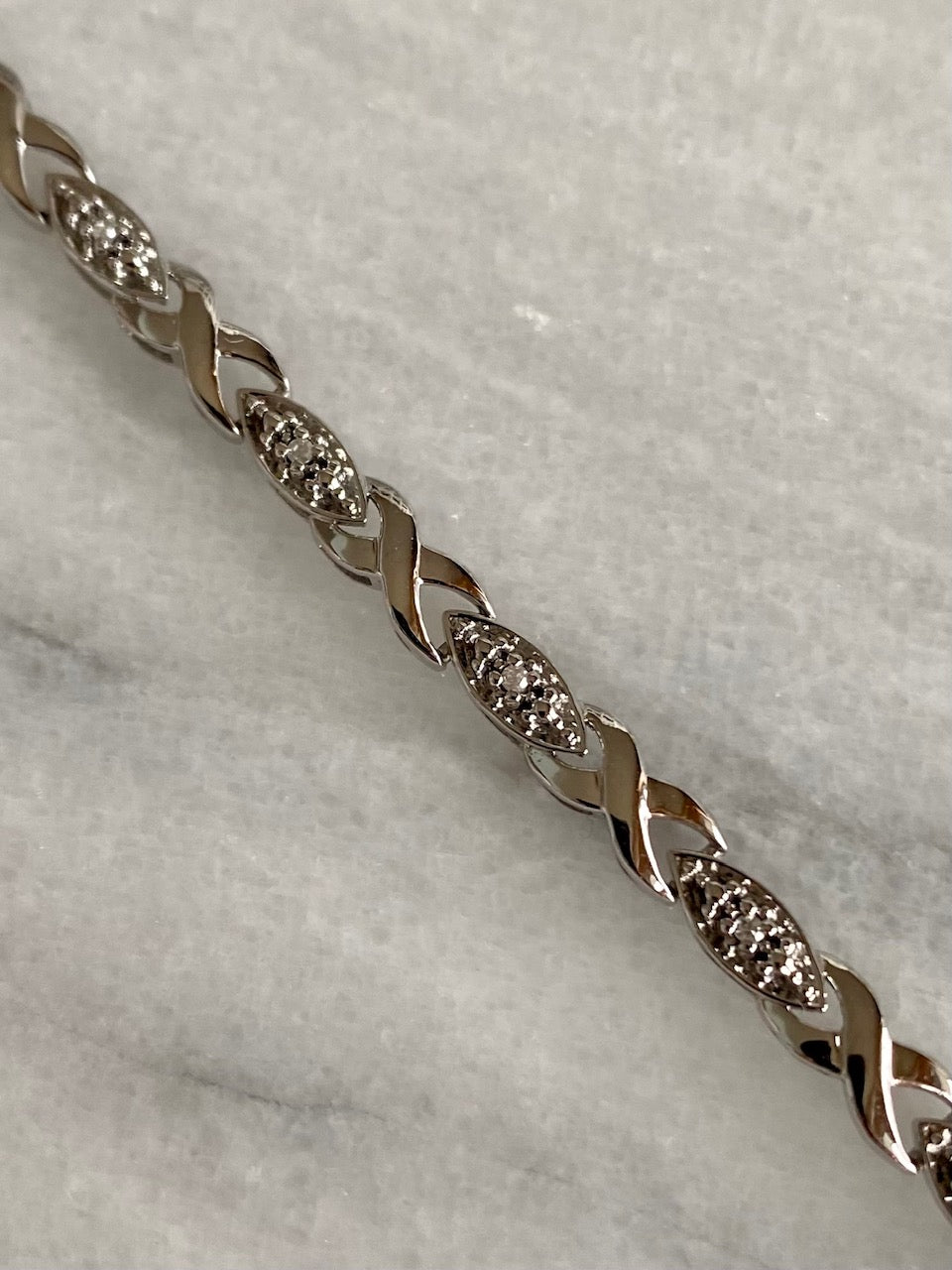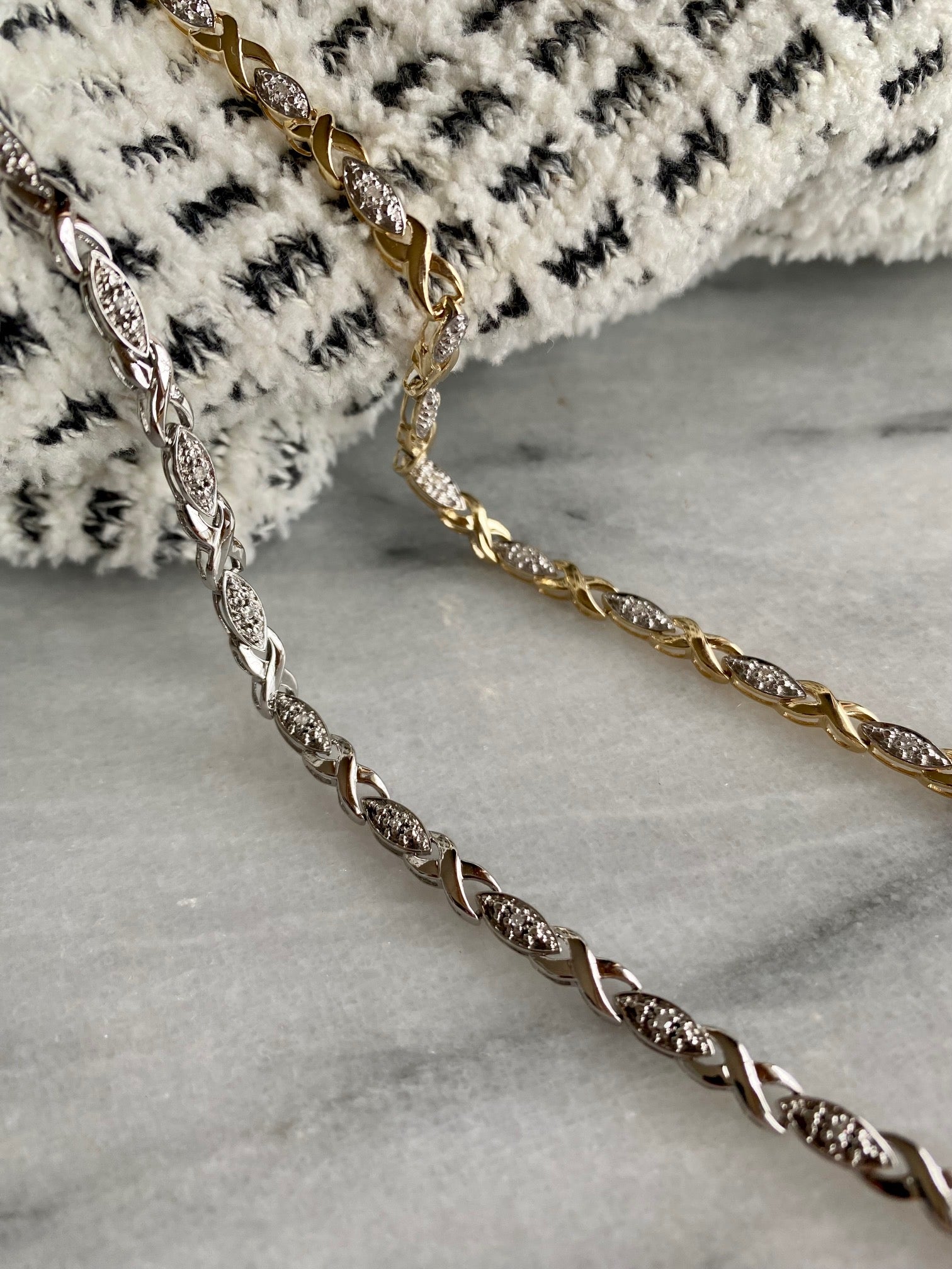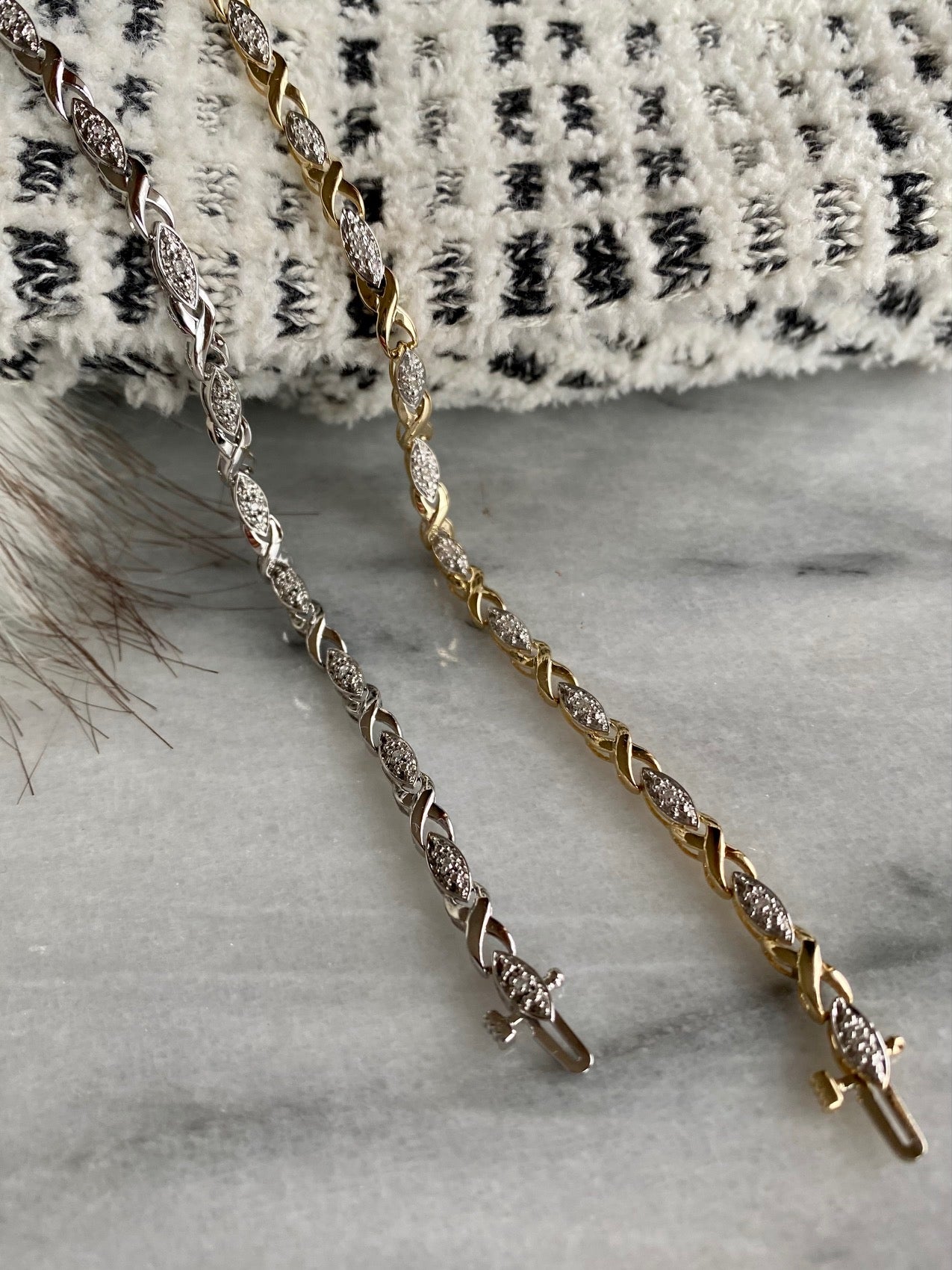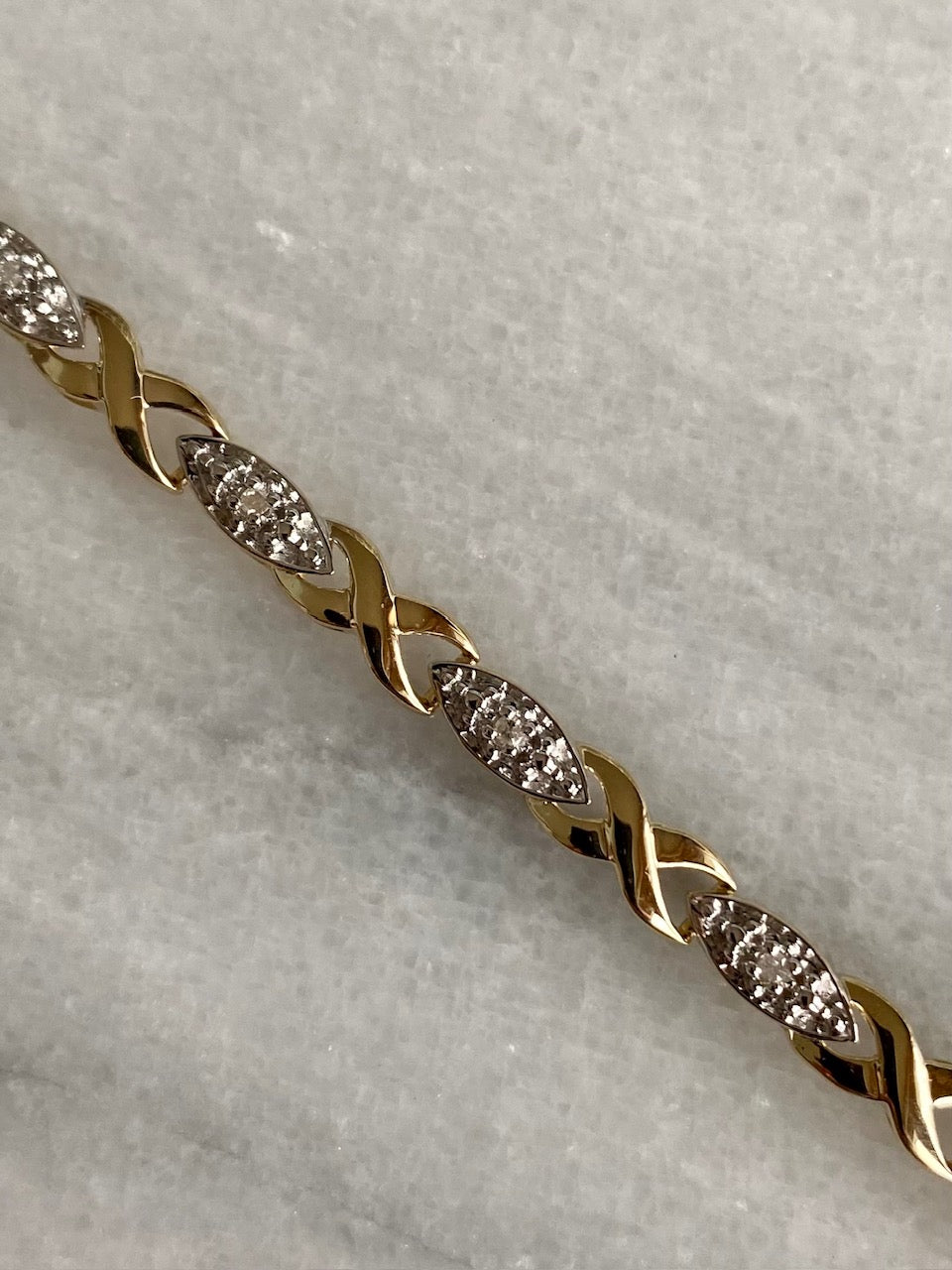 This gold and diamond bracelet features a timeless and sophisticated x's and o's style, crafted with high-quality 10 karat gold. With its elegant design and sparkling diamonds, it is sure to make a stunning impression.