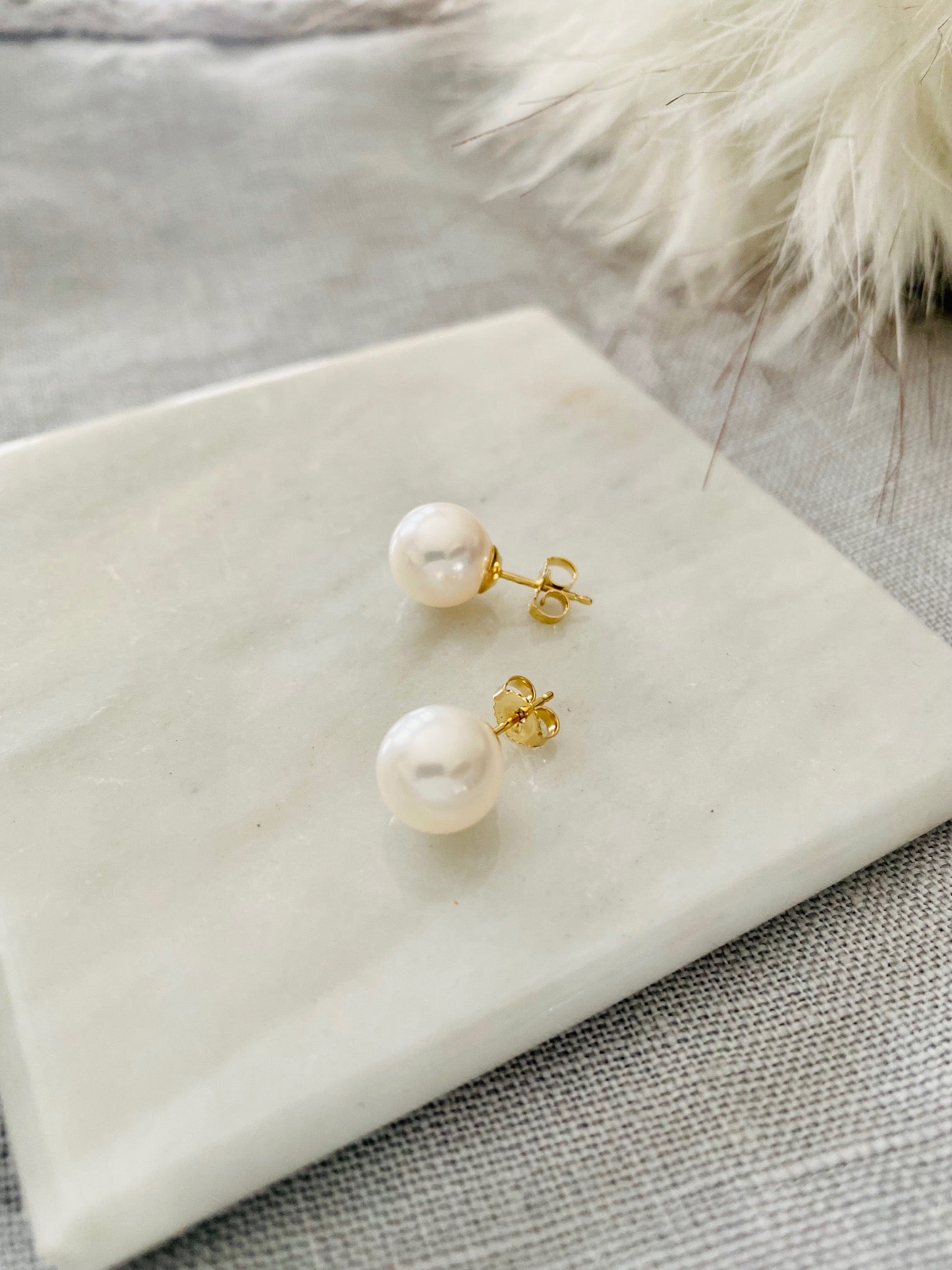 For your wedding day or every day, pearl studs are always a good choice. Akoya cultured pearls are considered the highest quality with perfectly round shapes, thick nacer, bright mirror-like luster and neutral colors. These studs are set on 14K white or yellow posts and with matching karat gold backs. Shown here in 7.5mm size.