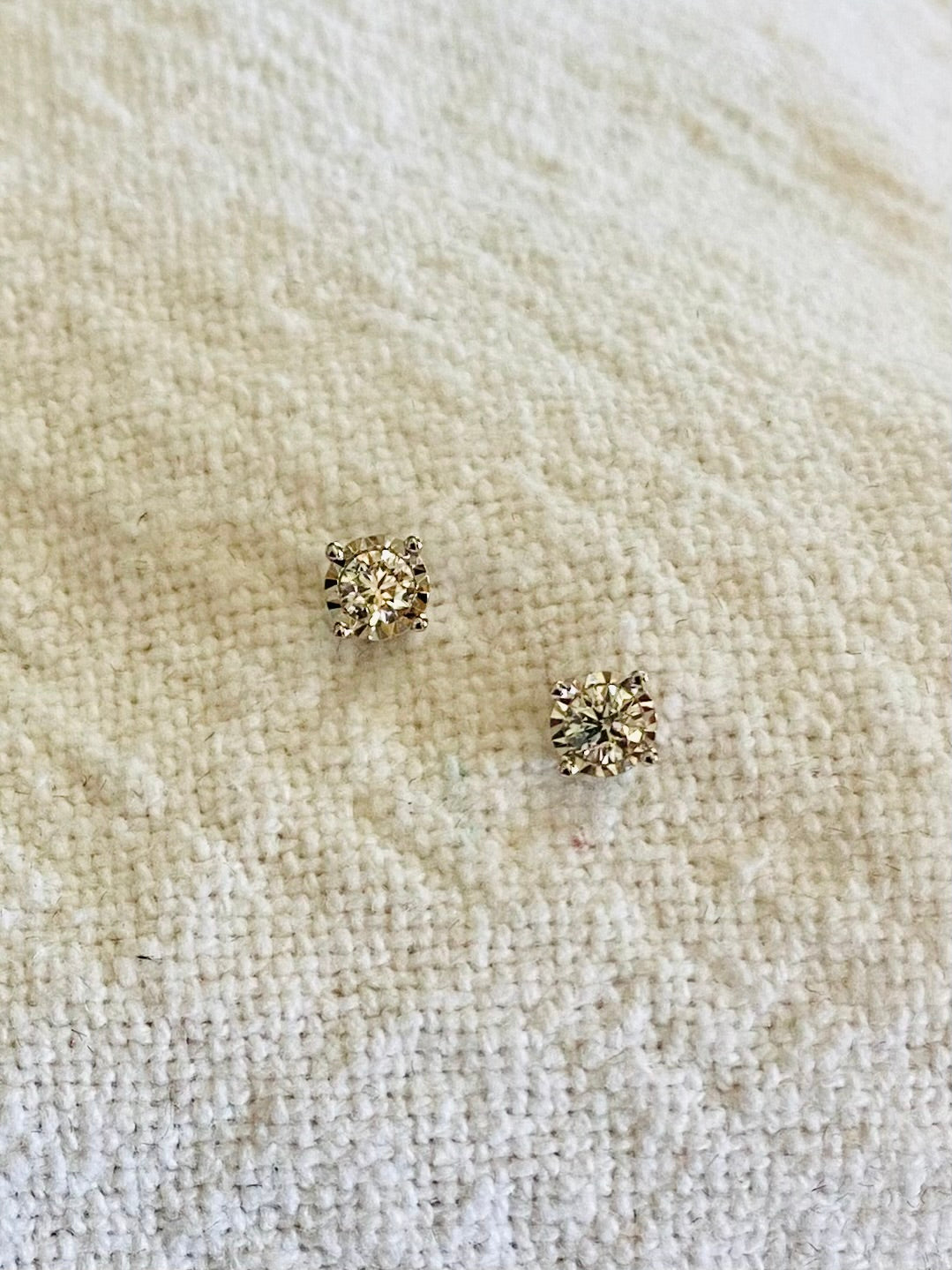 Illuminaire diamond studs are set in 10kt white Canadian gold illusion settings - the gold faceted frame surrounds the diamond to increase the overall size and brilliance. Available in a range of sizes. Shown in photo in 0.35cts.