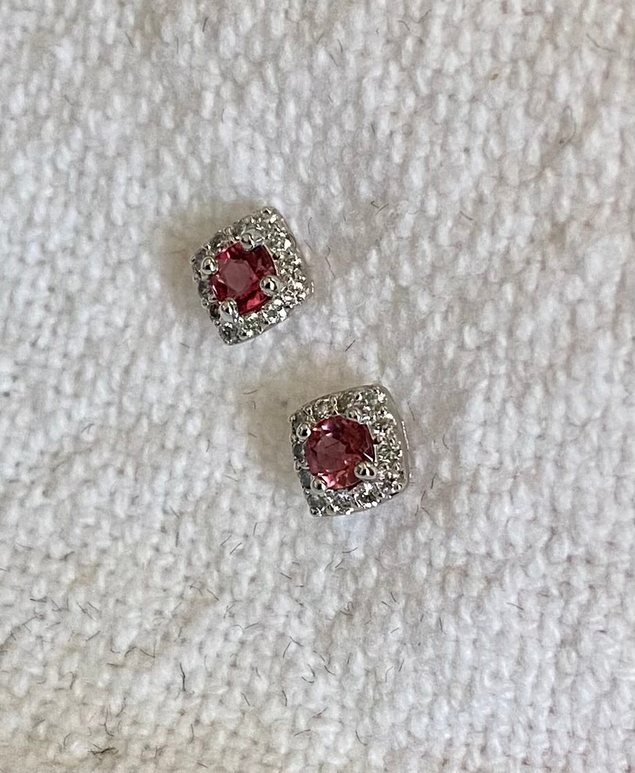 Beautiful cushion cut pink tourmaline stones are surrounded with a halo of genuine natural diamonds in these post back earrings. Pink tourmaline is the birthstone for October as well as a traditional choice for 8th wedding anniversaries. A matching pendant is also available.