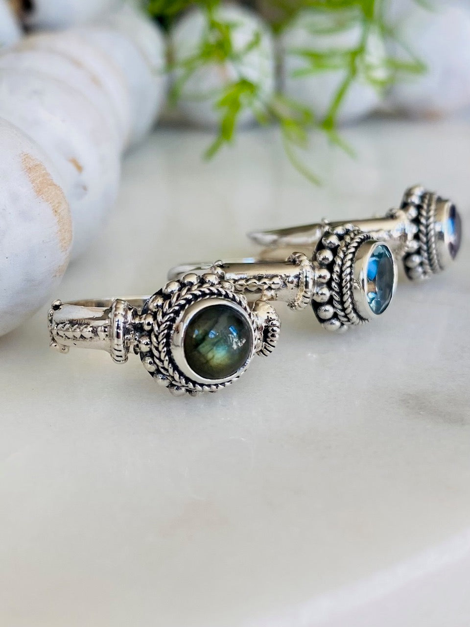 Sterling silver rings with genuine chalcedony, blue topaz or amethyst.