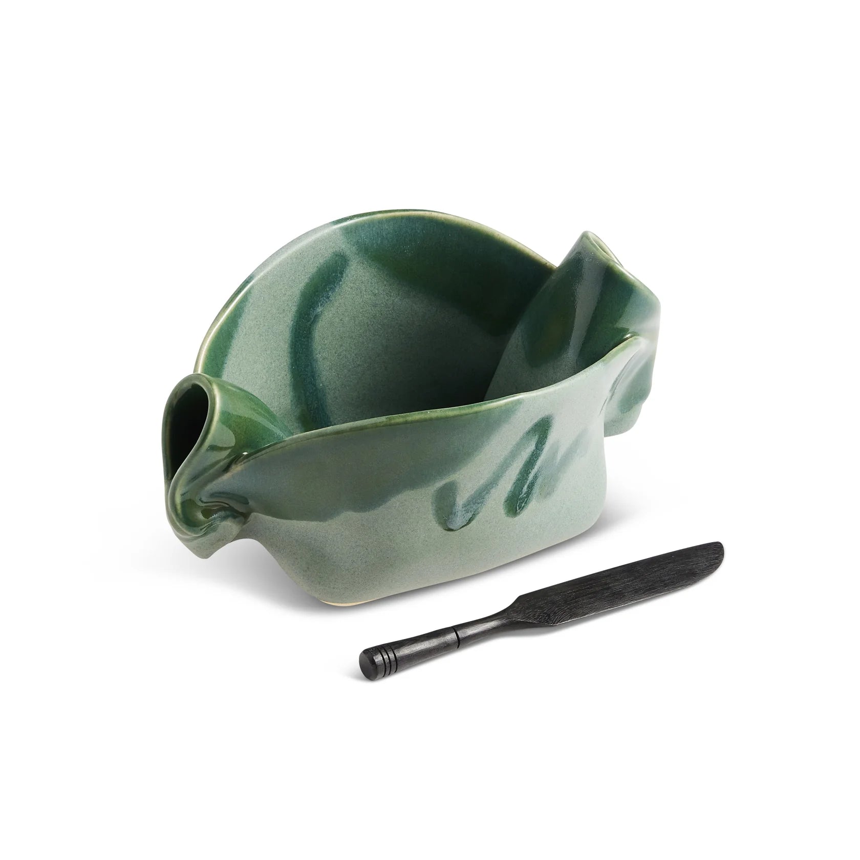 It comes with a rosewood knife. All of our pottery is oven, dishwasher and microwave proof as well as food and drink safe. All pieces are available in all glaze colours. Dimensions 7 × 4.5 × 3 in.