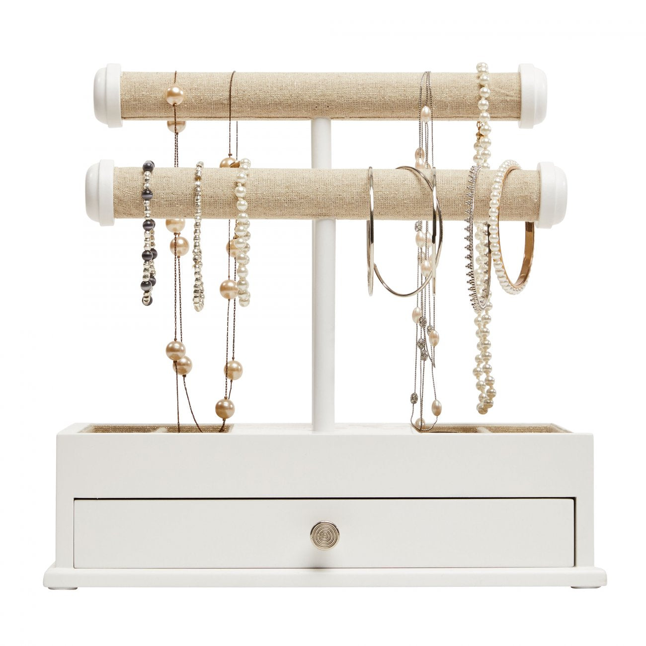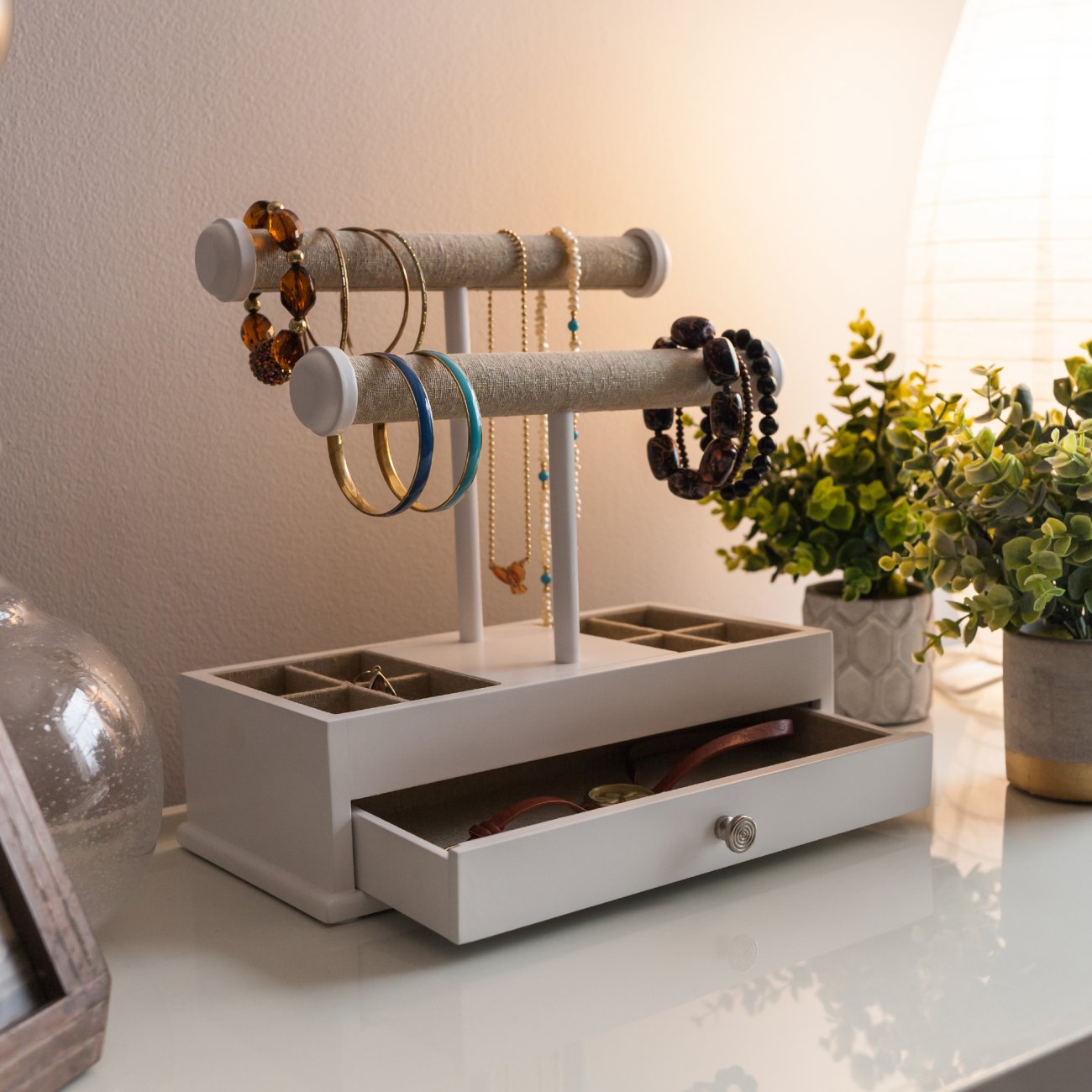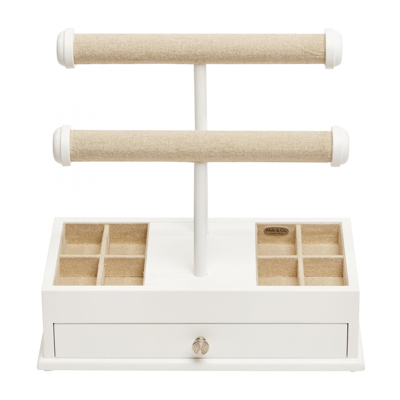 Clean and modern, the Mele and Co Ivy jewelry box and organizer has an open design for easy access to your favourite every-day jewelry. Featuring two staggered jewelry bars to display your necklace and bracelet collection, eight divided sections for rings and earrings, plus a drawer offering open area storage, this jewelry stand is sophistication simplified.