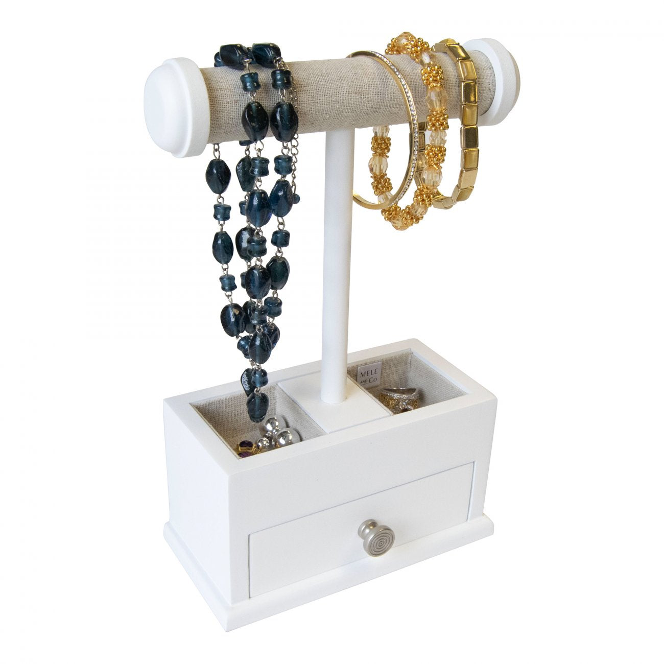 Clean, modern, and now mini! The Mele and Co Mini Ivy jewelry box and organizer has an open design for easy access to your favourite every-day jewelry. Featuring a single jewelry bar to display your necklace and bracelet collection, two divided sections for rings and earrings, plus a drawer offering open extra storage. White finish with beige linen.