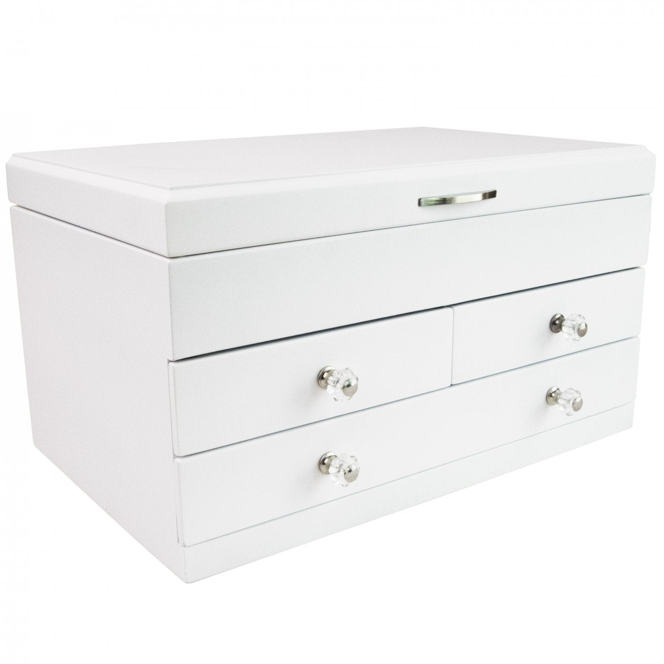 Traditional styling and delicate accents give the Mele and Co Fairhaven jewelry box an unmistakable elegance. Storage capabilities are endless with multiple draws and sections, including 7 hook necklace drops. Now available in a white finish, with grey suede interior.