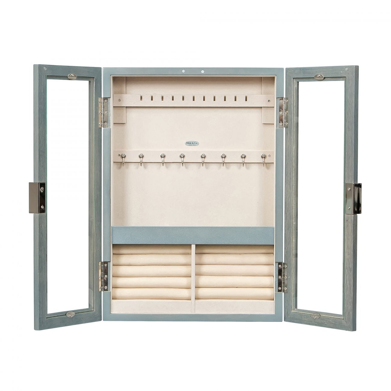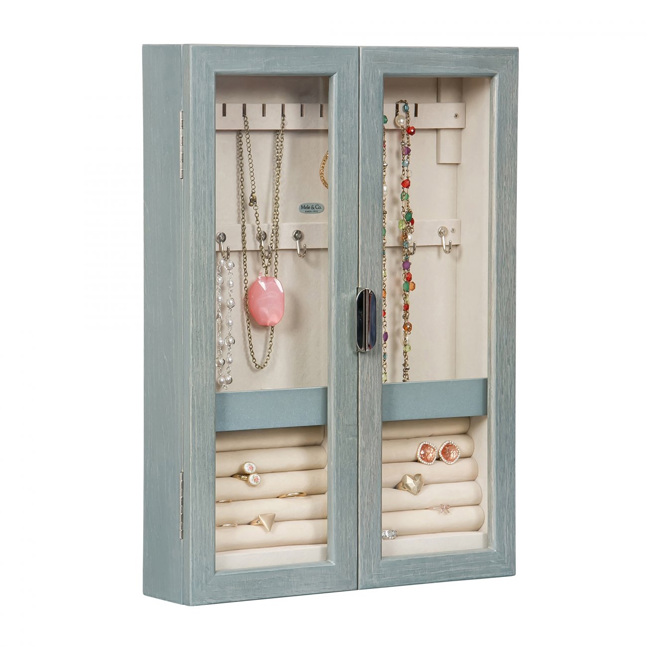 Elegant, yet sublimely simple in design, the Mele and Co Leia hanging jewelry cabinet ensures that all your treasures are close at hand. Open the glass doors to access necklace hooks, earring bars, ring rolls and open area sections, allowing you a full range of organizational options. A savvy storage solution, this wall mount jewelry cabinet will keep your jewelry under cover and off your dresser top!