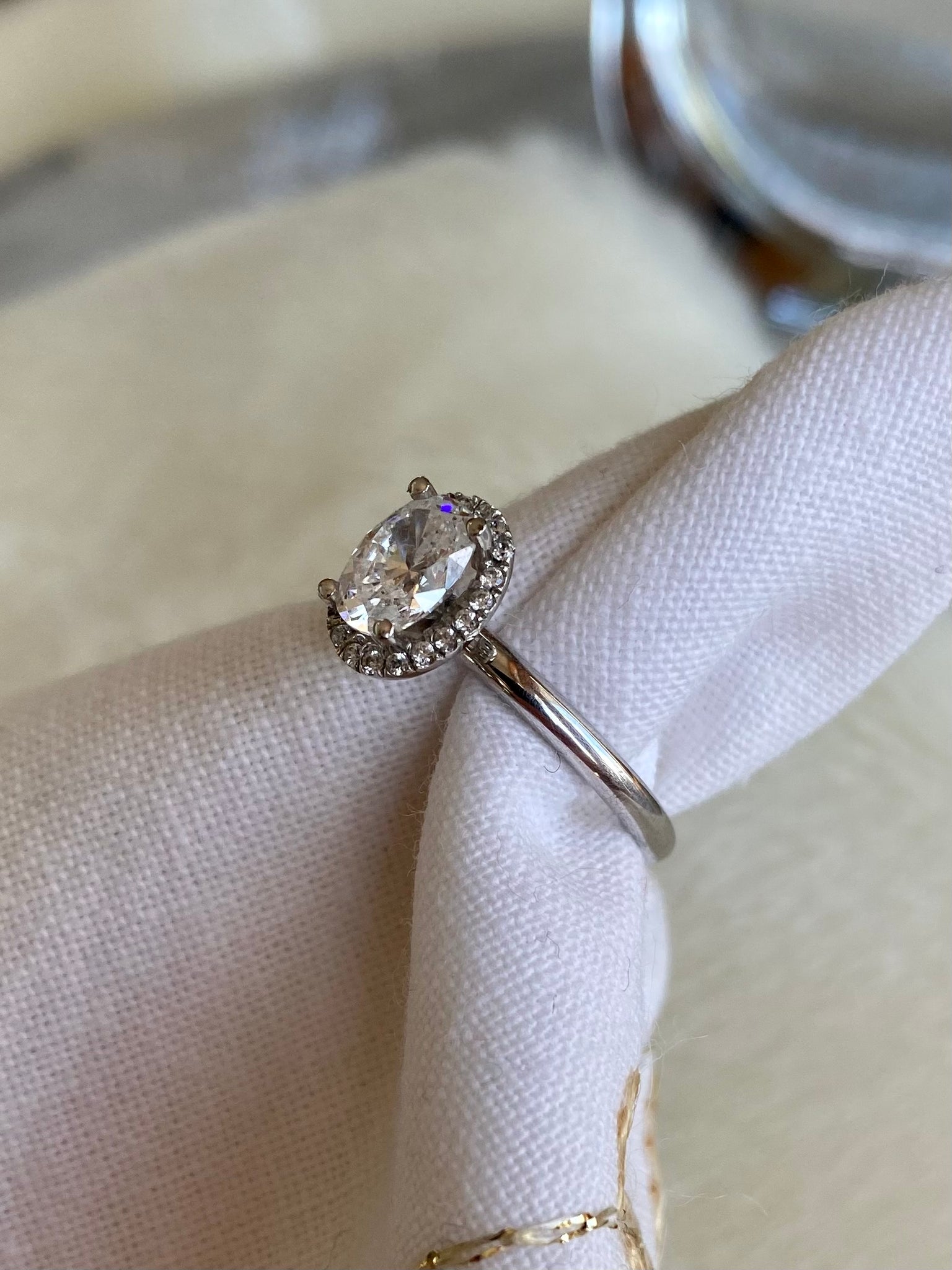 This stunning engagement ring showcases an oval shape with a diamond halo surrounding the central stone.