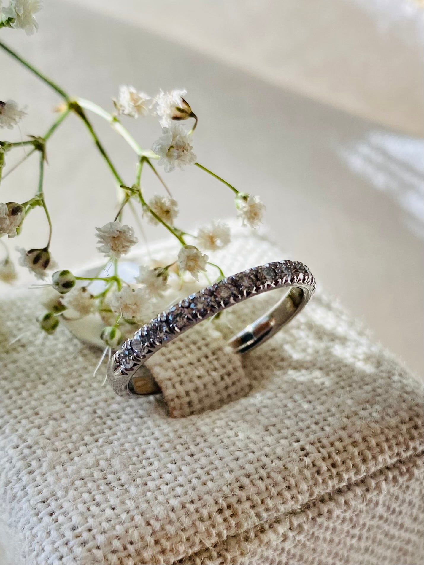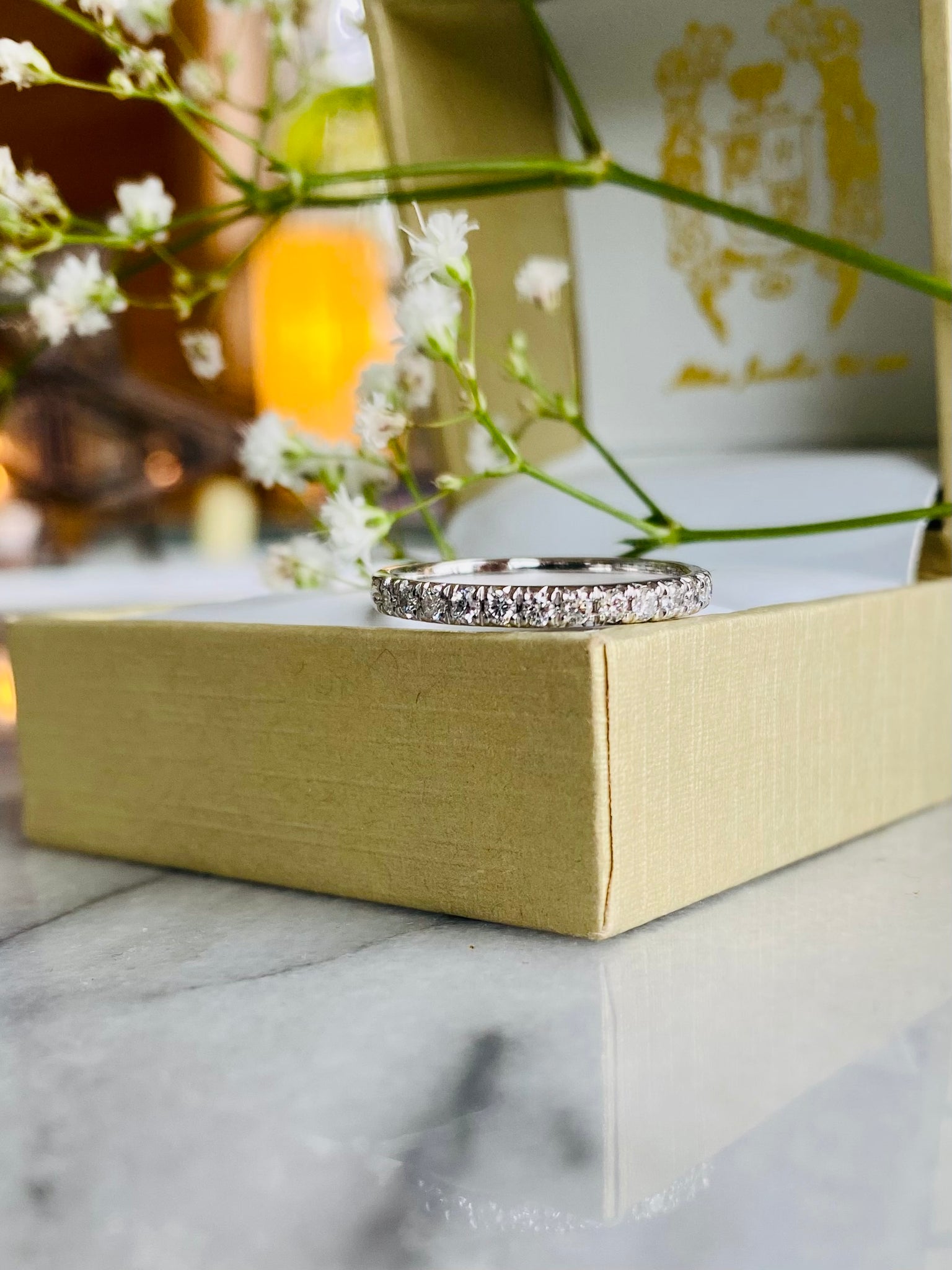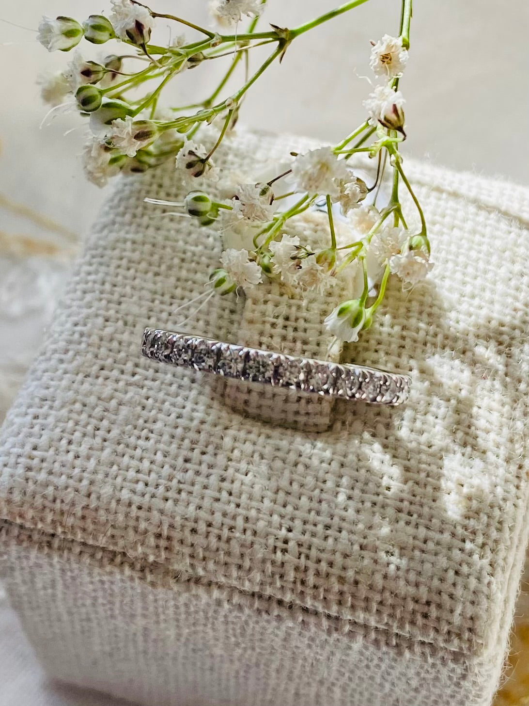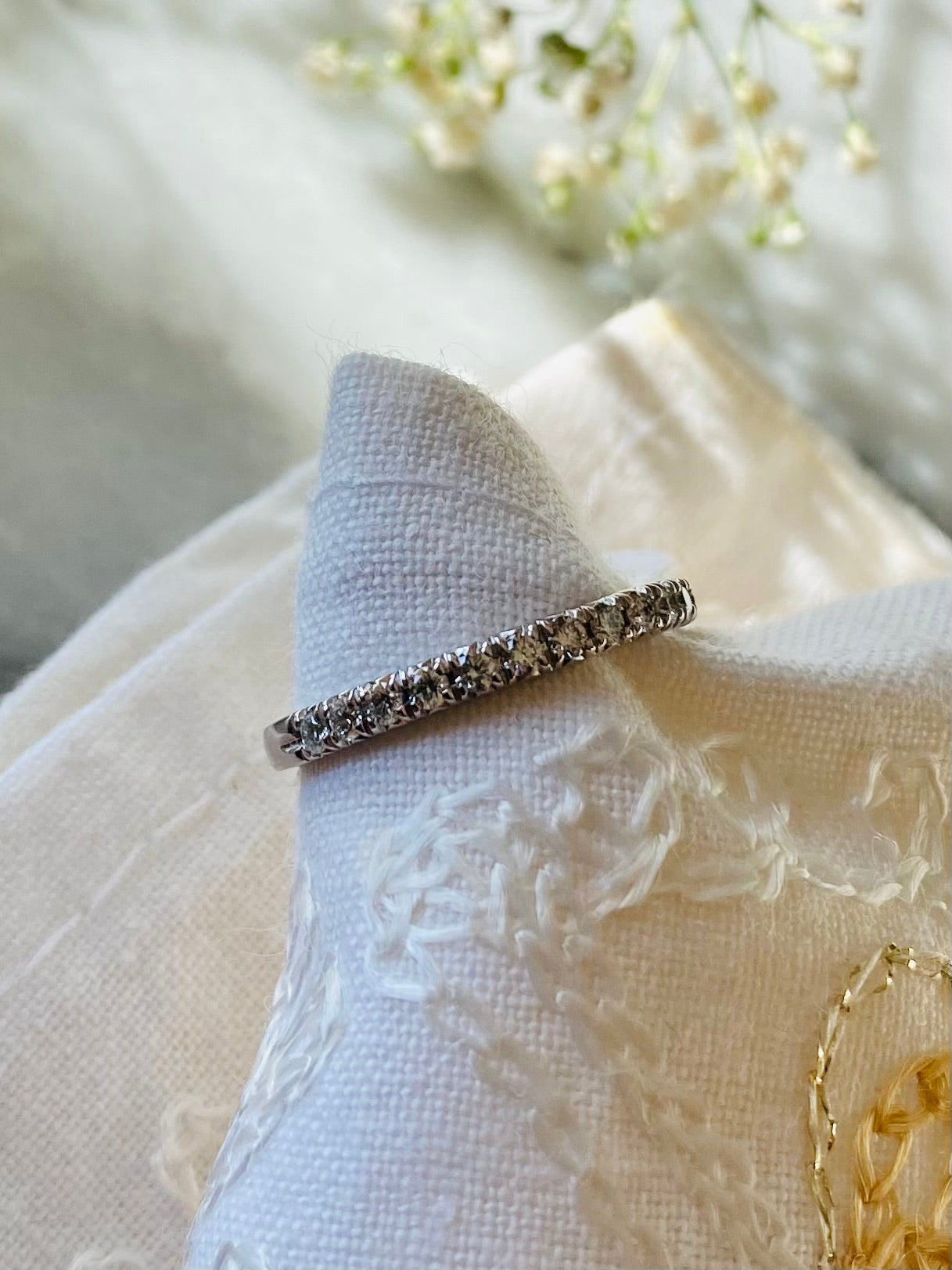 14k white gold diamond band with 15 full cut diamonds with a total carat weight of 0.33cts.