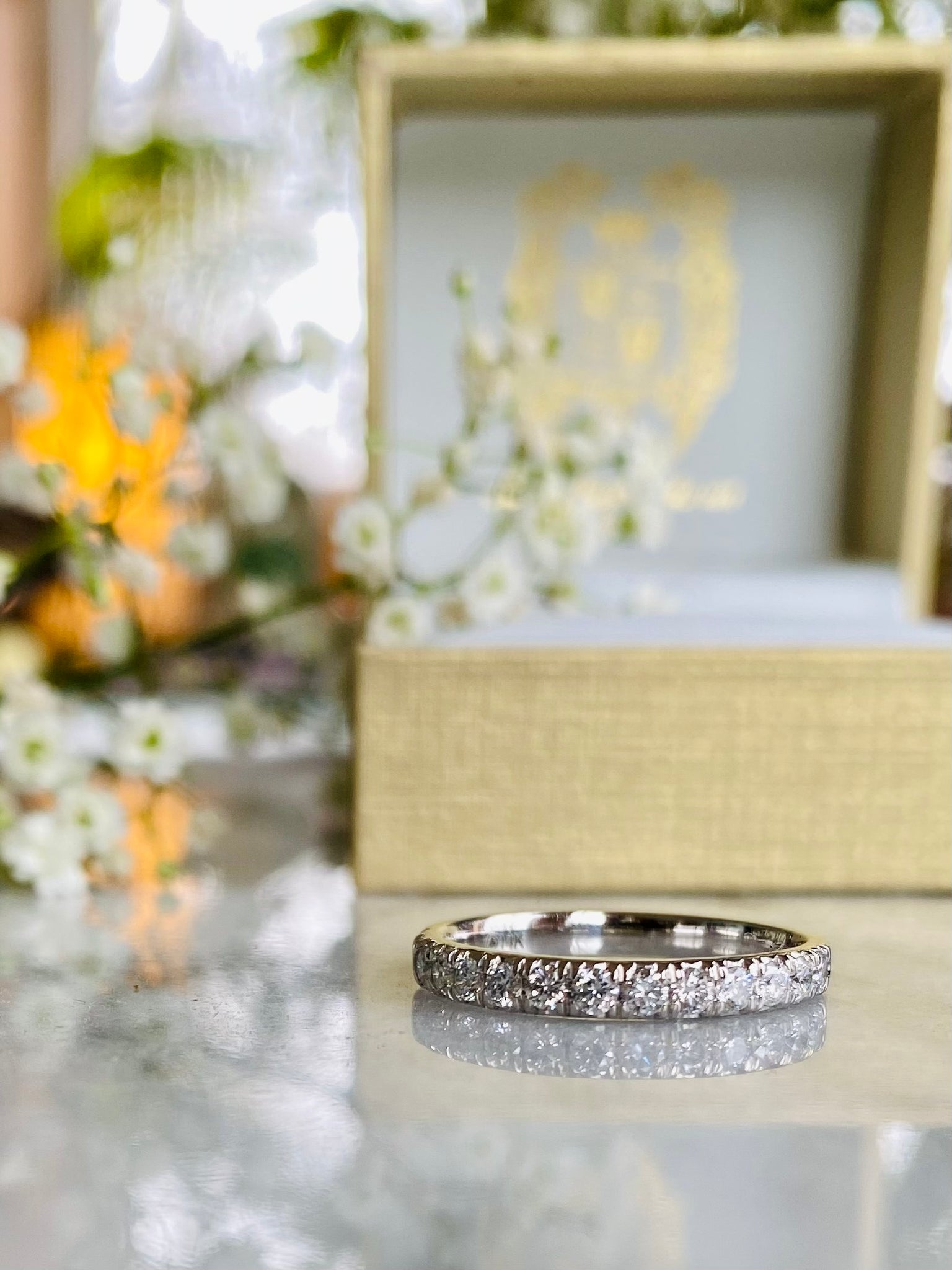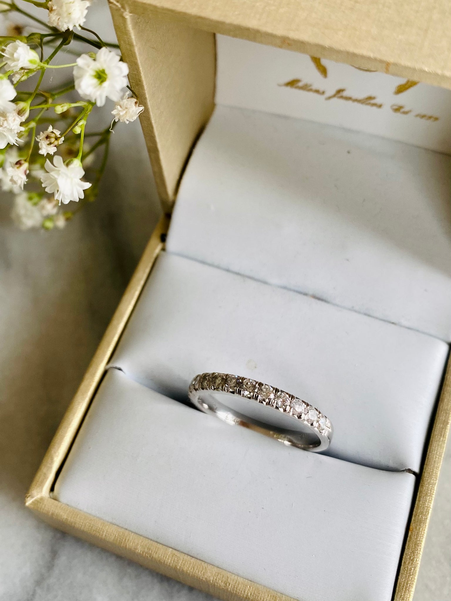 14k white gold diamond band featuring 14 full cut diamonds with a total carat weight of 0.50cts