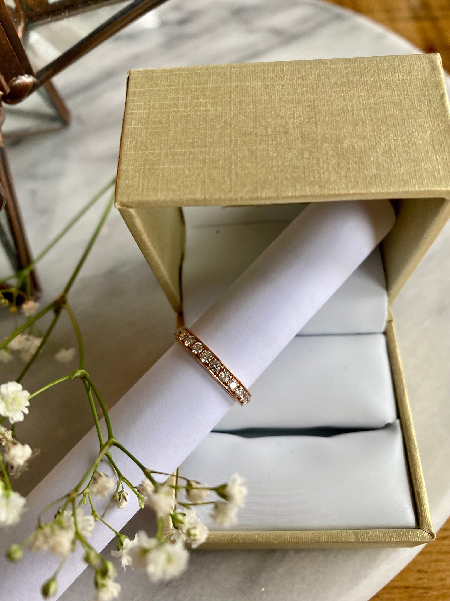 Channel set diamond band in 14k rose gold featuring 0.50 carats total weight in full cut diamonds