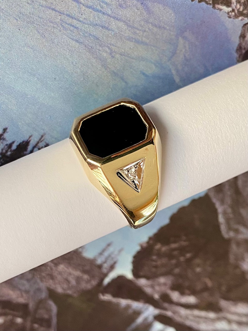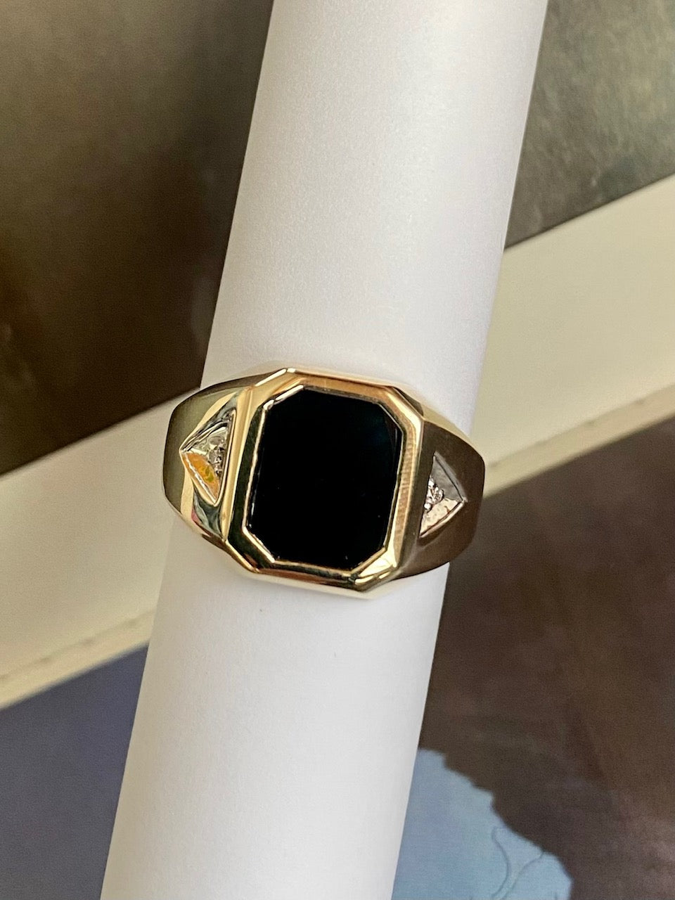 This men's 10K yellow gold onyx ring features 2 full cut diamonds, totalling 0.03 carats. Enhance your style with this elegant black onyx ring. Perfect for the fashion-savvy man.