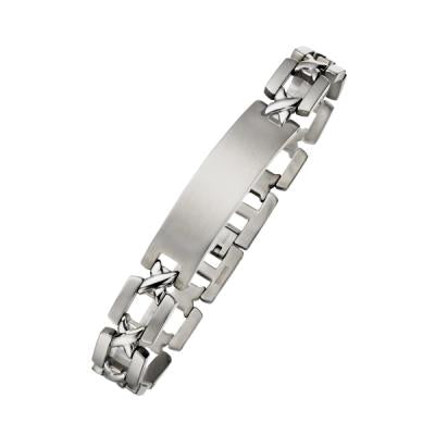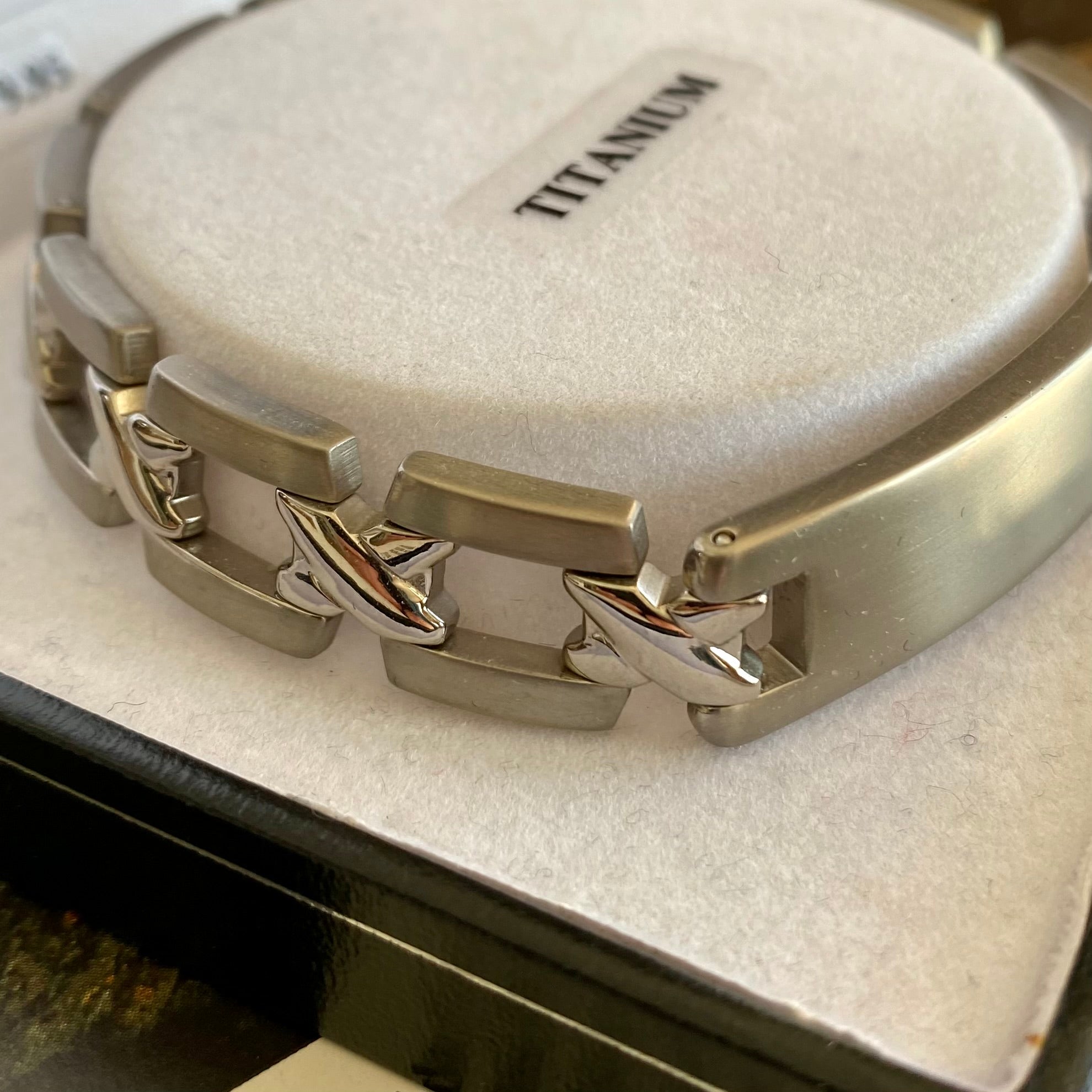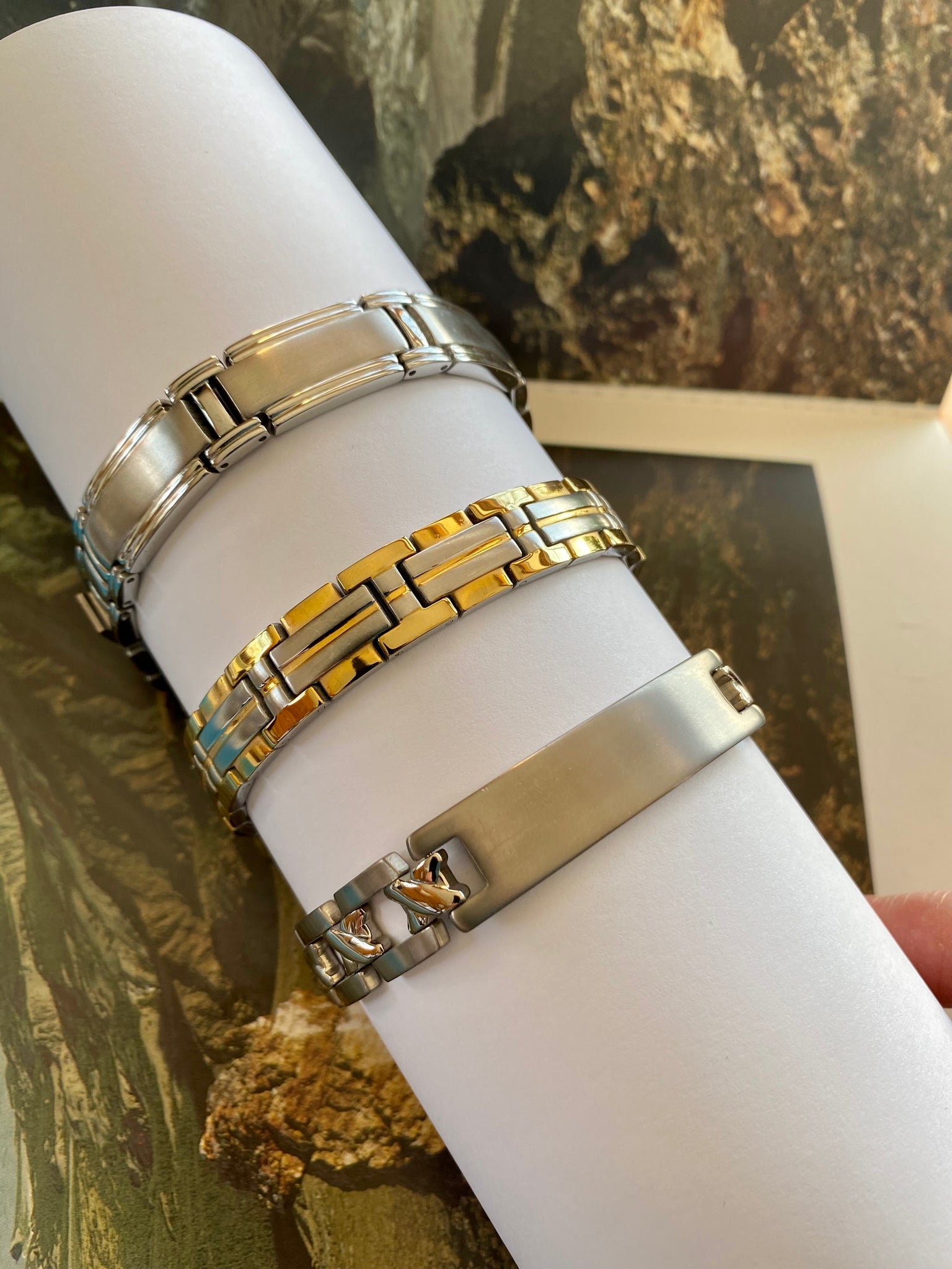 This is a Titanium bracelet with ID plate in the centre. Titanium is very light weight metal weighing only 1/3 the weight of gold. It is hard and durable metal used as a main component on NASA space shuttles. It is hypo allergenic, perfect for those with sensitive skin, making it the metal of the millennium.