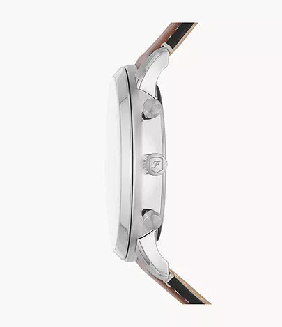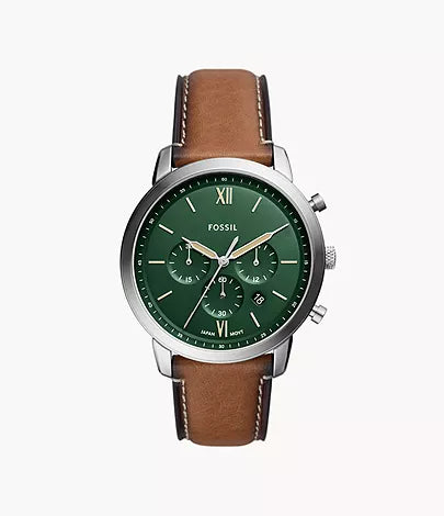 This 44mm Neutra watch features a green matte dial, chronograph movement and tan LiteHide™ leather strap.