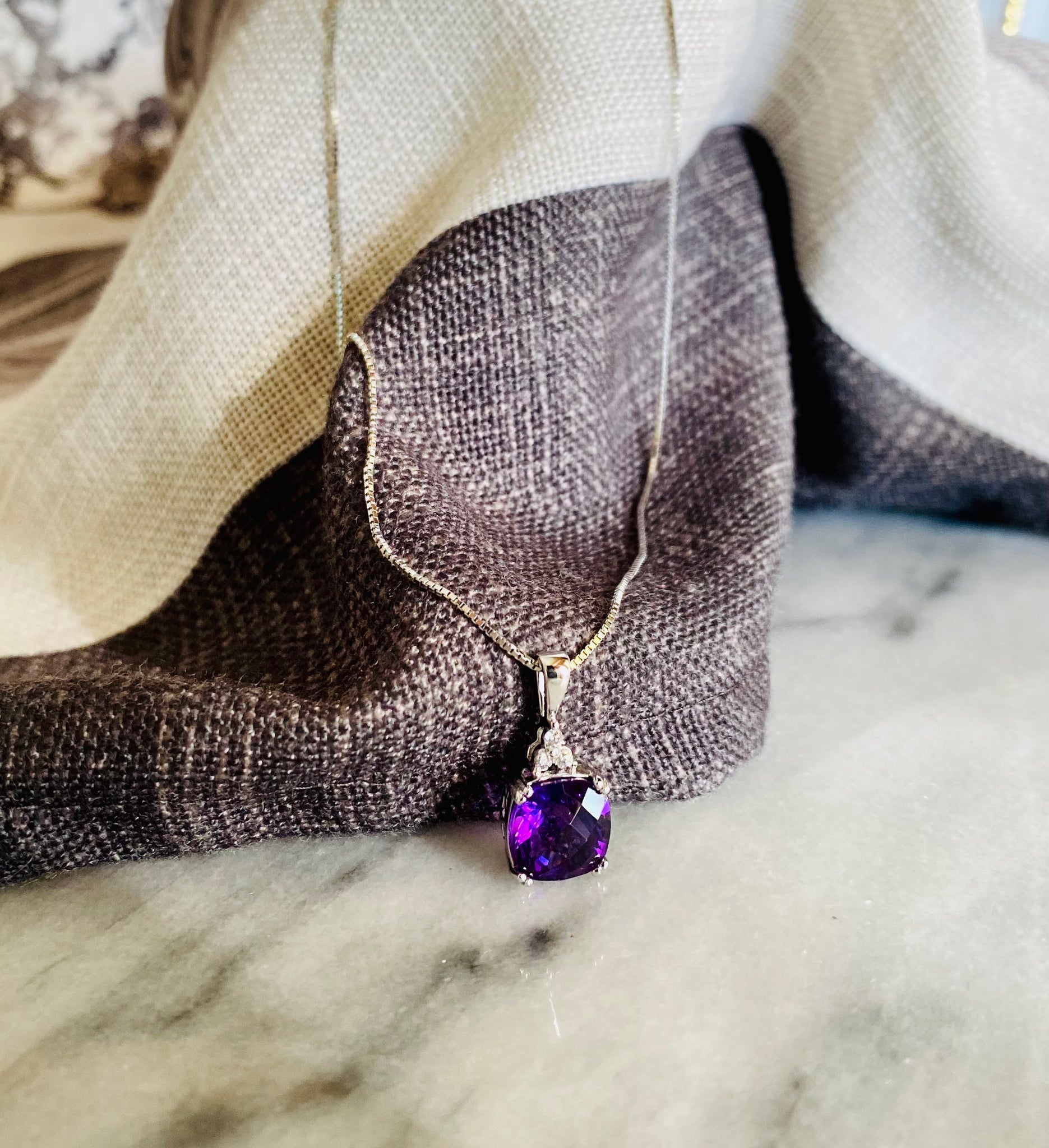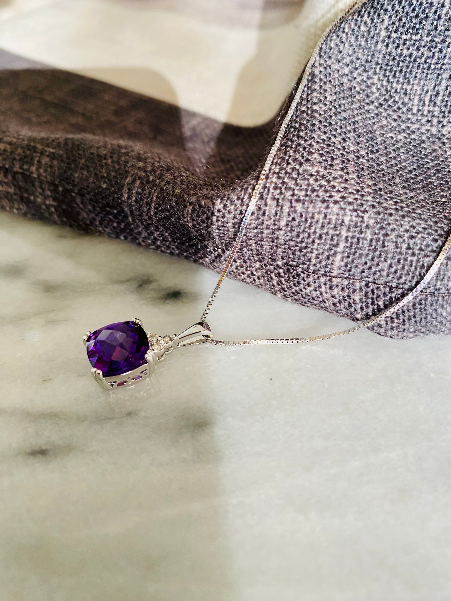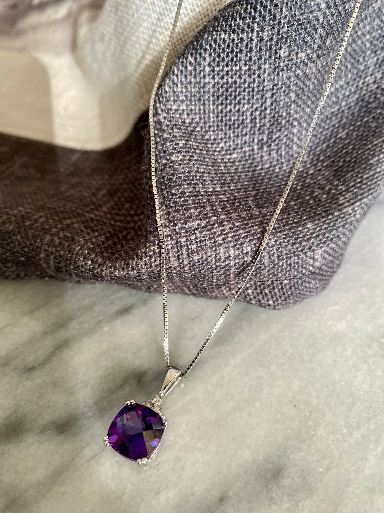 This faceted amethyst necklace is a soothing shade of purple set in luxurious 10K white gold and adorned with 3 full cut diamonds, each with a total carat weight of 0.05cts. amethyst is the birthstone for February and the traditional gemstone for 6th wedding anniversaries. Coordinating earrings are available.