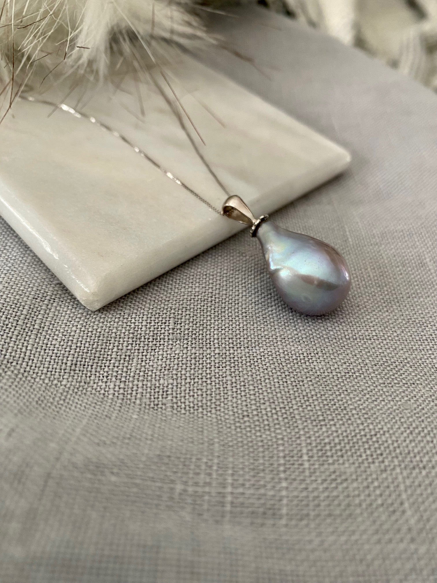 A gorgeous silver freshwater baroque pearl with 14k bale on a 18" 14k white gold chain. Baroque pearls are renowned for their stunning beauty and irregular shapes, making each piece truly one-of-a-kind. Crafted with a 14k white gold bale and set on a 14k white gold chain, this necklace is an elegant addition to any jewelry collection. Elevate your style with the unique and timeless allure of baroque pearls.