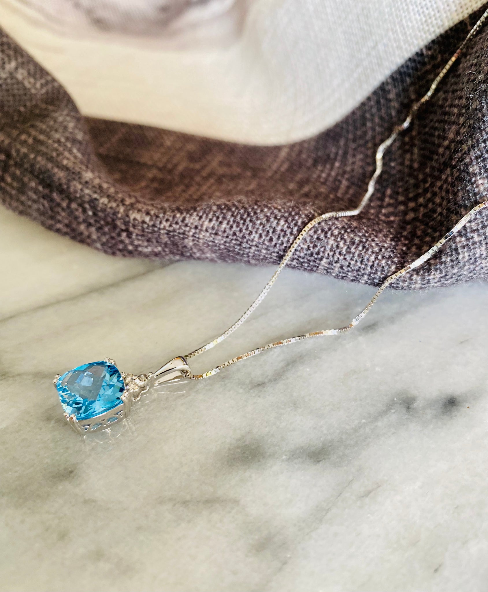Like the tranquil ocean, this faceted blue topaz necklace is a soothing shade of blue set in luxurious 10K white gold and adorned with 3 full cut diamonds, each with a total carat weight of 0.05cts. Blue topaz is the birthstone for December and the traditional gemstone for 4th wedding anniversaries. Coordinating earrings are available.