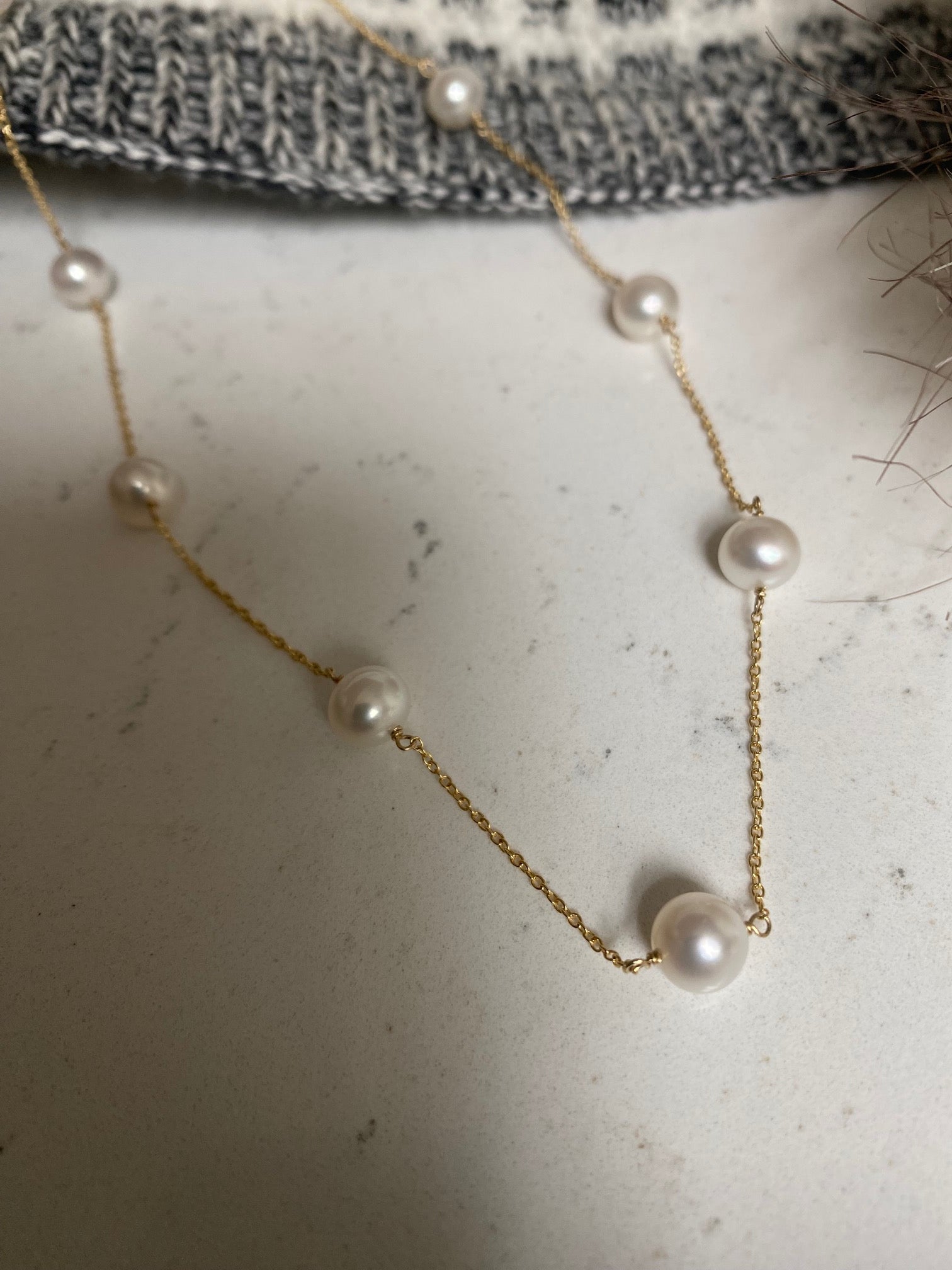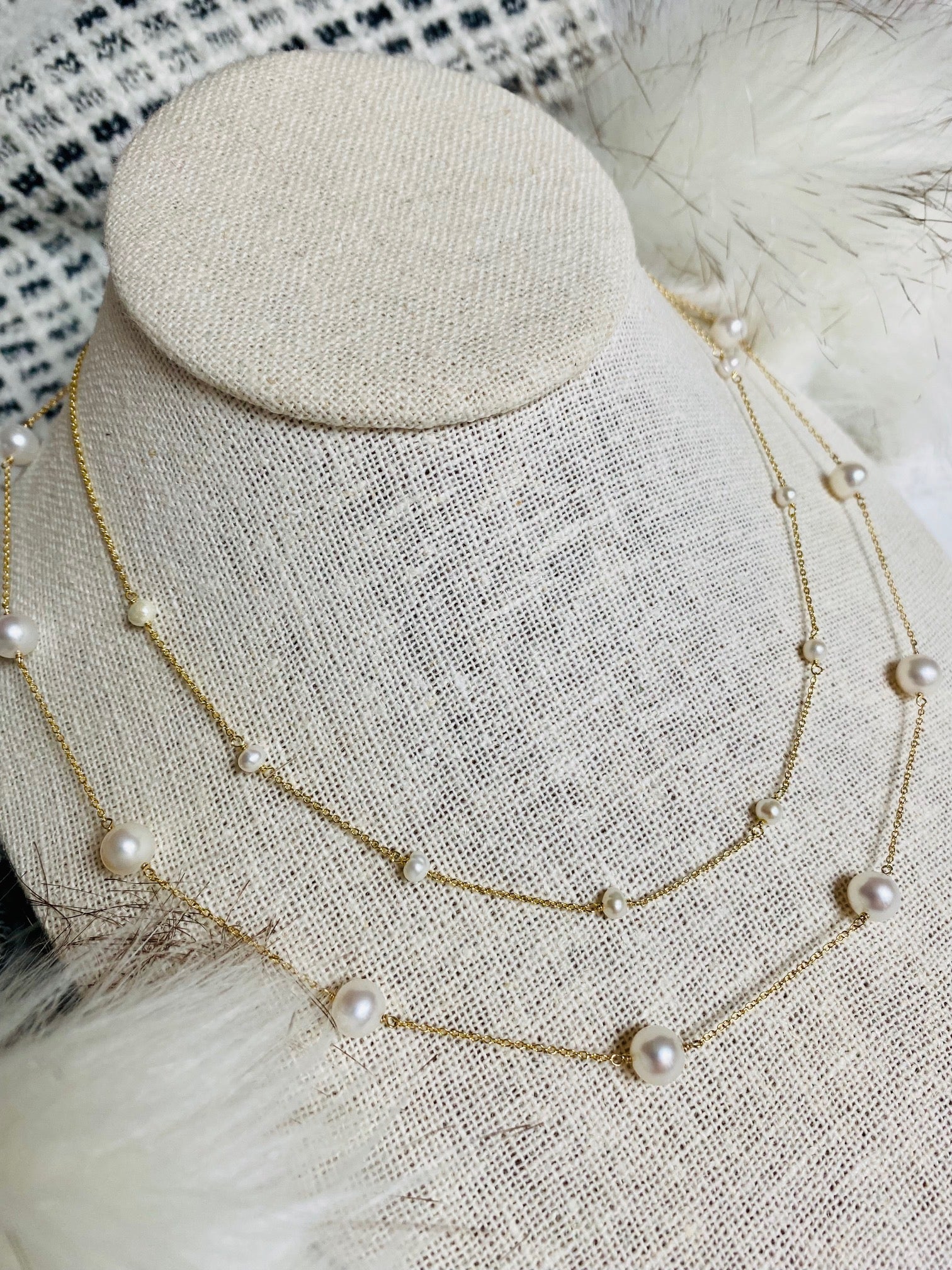 Delicate and classic pearl by the yard style necklace with fresh water pearls and 14k yellow gold. (In image 3, necklace is the lower of the two shown)