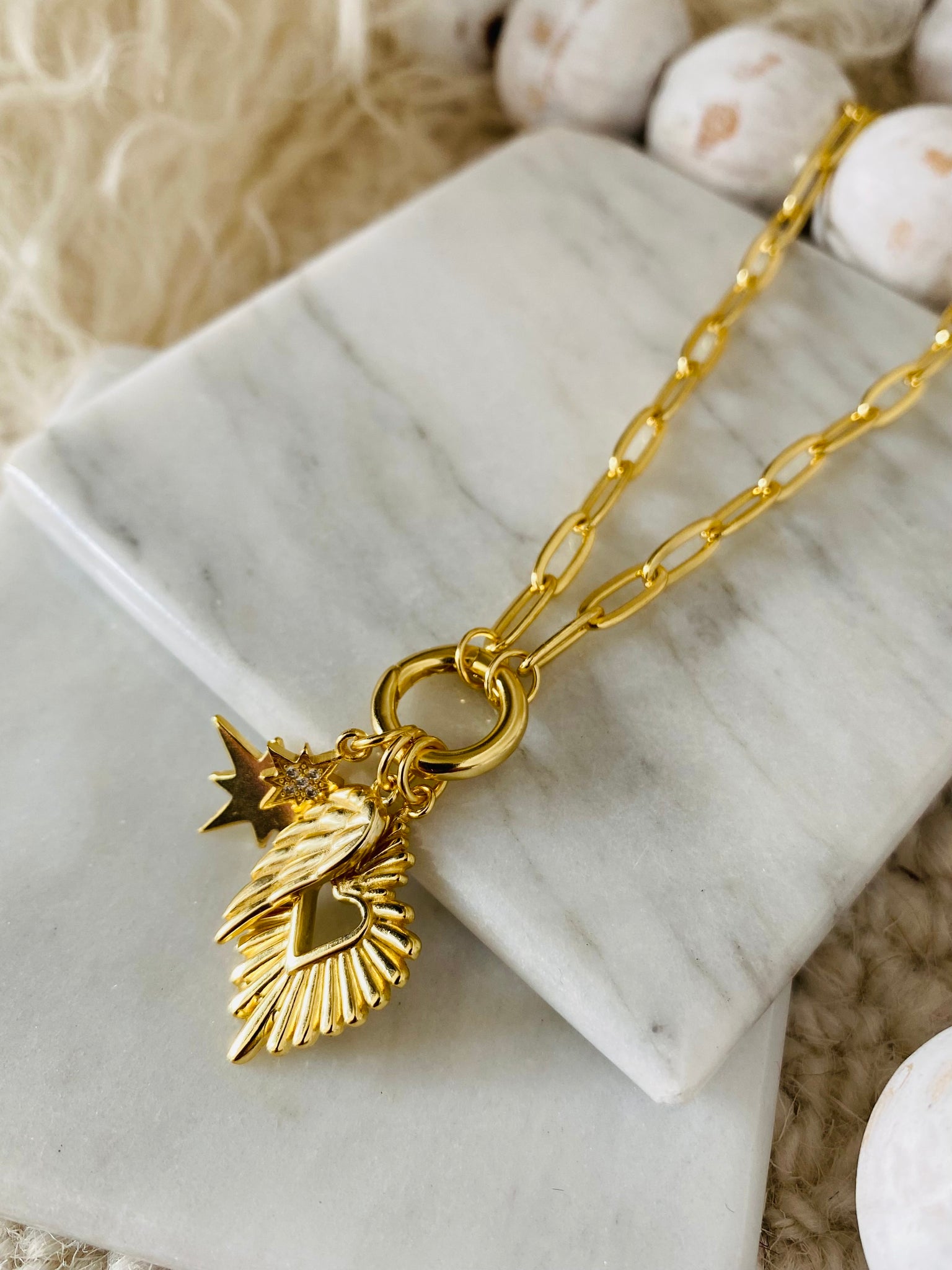 Slide a necklace enhancer onto your favourite chain for an easy way to add several charms or pendants at once for a modern take on the charm necklace.