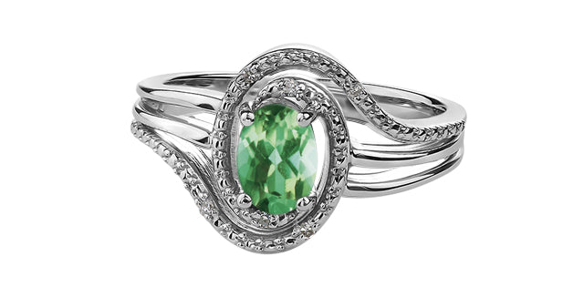 Beautifully styled, this sterling silver birthstone ring features a genuine birthstone with a surround of diamonds to off-set each stone. Can be purchased with matching pendant and earrings. All months available. Shown here in Peridot - August.