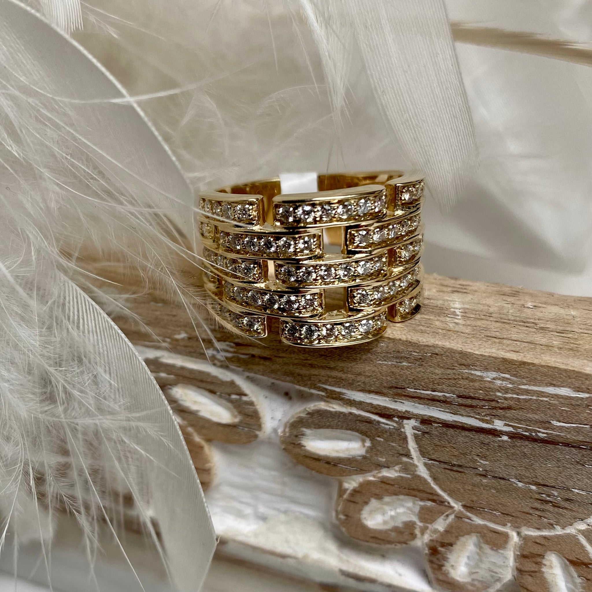 A ring to wow with - this statement diamond ring features 90 full cut diamonds with a total carat weight of 1.0cts set in 10k yellow gold with a substantial shank. Available to order in white gold if preferred.
