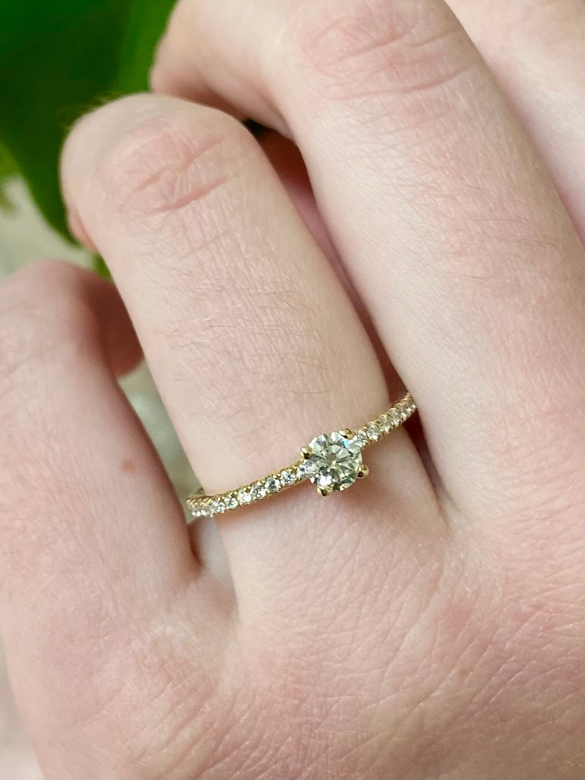 An engagement ring by Canadian designer, sculptor and goldsmith Noam Carver in 14k yellow gold with 23 round cut diamonds with a total carat weight of 0.17cts on the shoulders of the band. The centre diamond is a round cut 0.33ct stone. Shown in here featuring the matching wedding band.