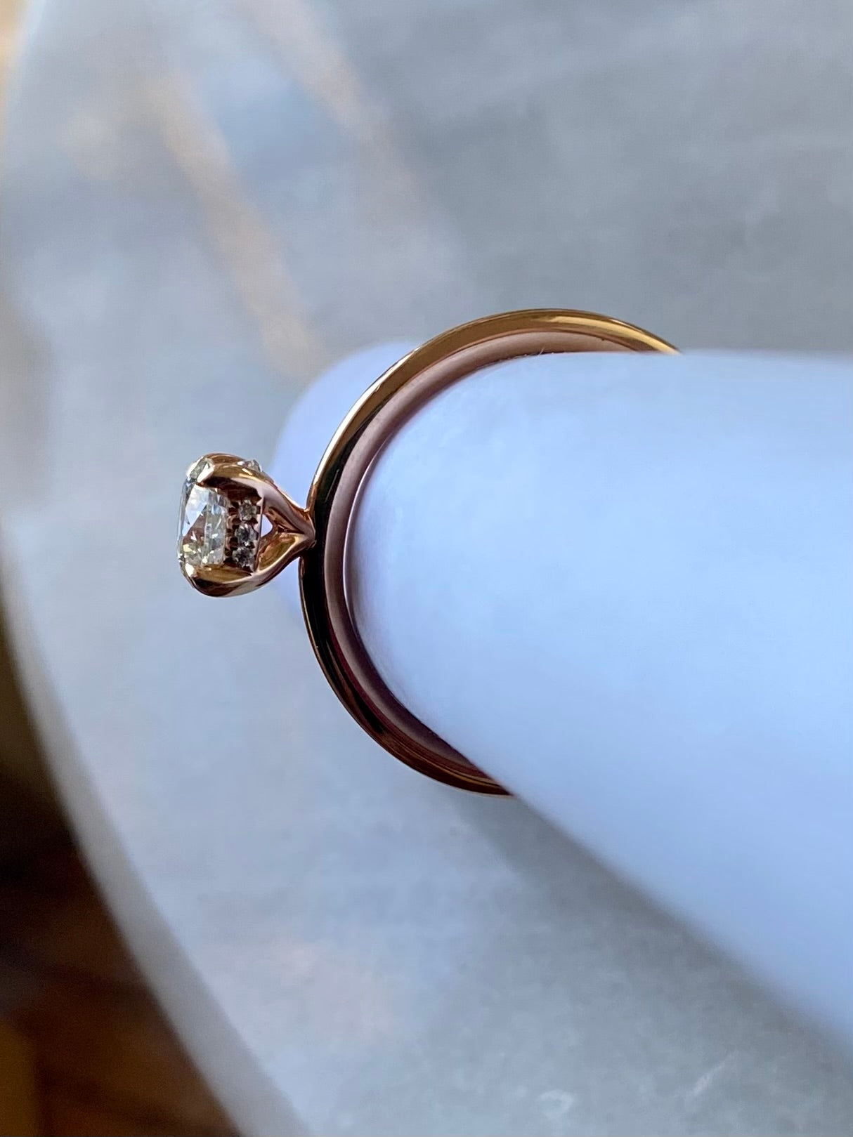 This engagement ring, created by respected Canadian designer Noam Carver, showcases subtle sparkle within a classic, sophisticated design. Crafted from 14K rose gold, it boasts a center stone of 0.5ct and a hidden halo of 12 stones with a total carat weight of .03cts, making it a lasting and impressive choice.