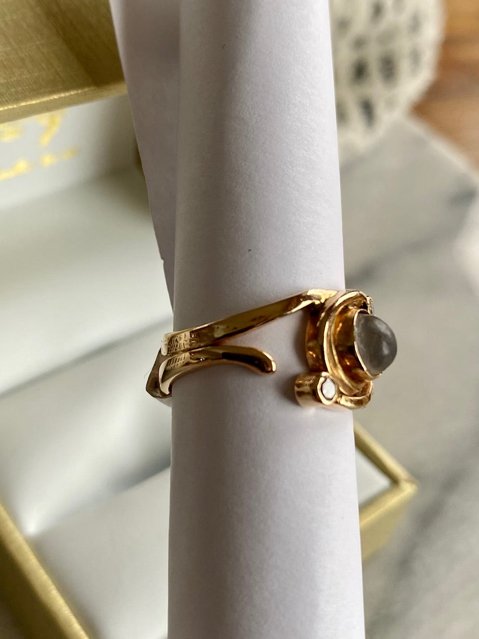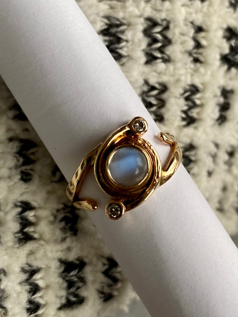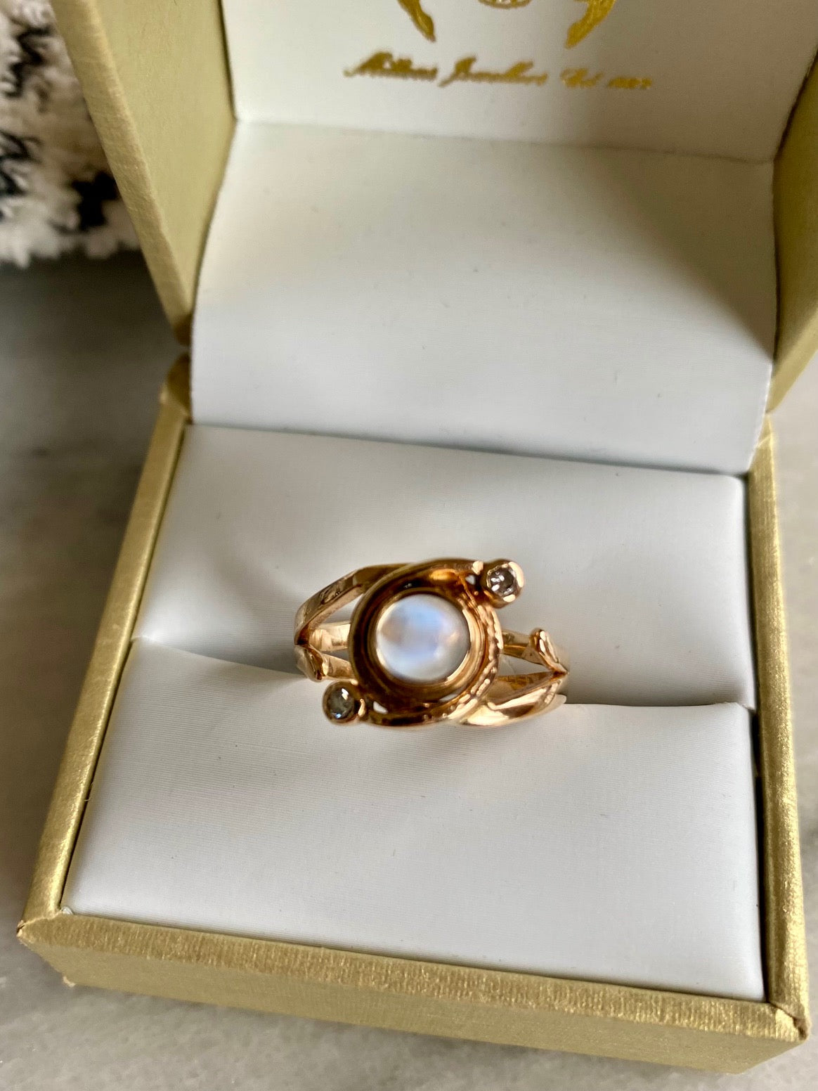 This 14k gold ring has a captivating design and is set with an exquisite moonstone and diamond combination, making it a truly one-of-a-kind piece.