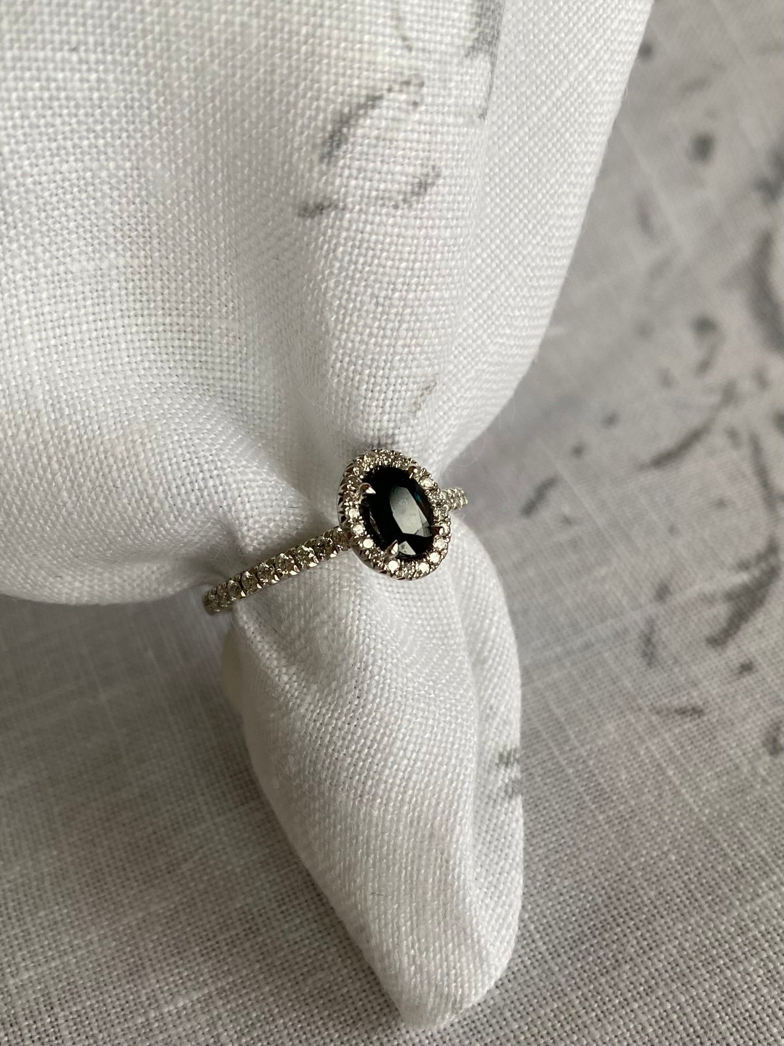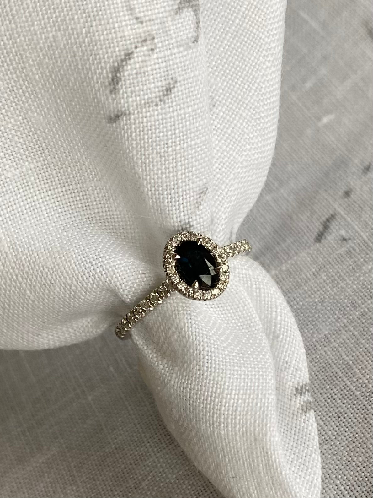 Blue sapphire ring with a diamond halo and diamond encrusted shoulders