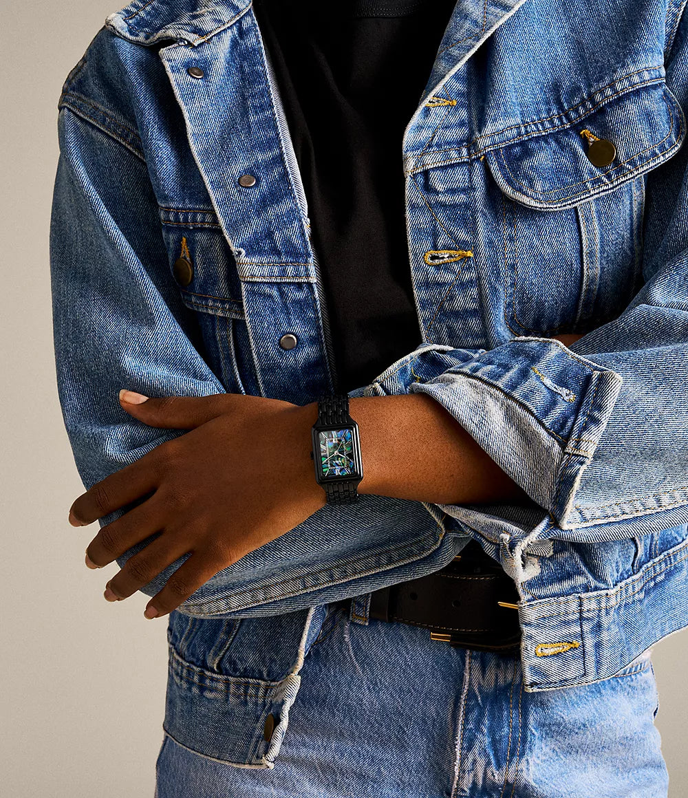A true icon from our archive, the rectangular Raquel watch is updated with stunning details. Slim and versatile, it features a polished black genuine abalone shell dial, three-hand date movement and a polished black stainless steel seven-link bracelet.