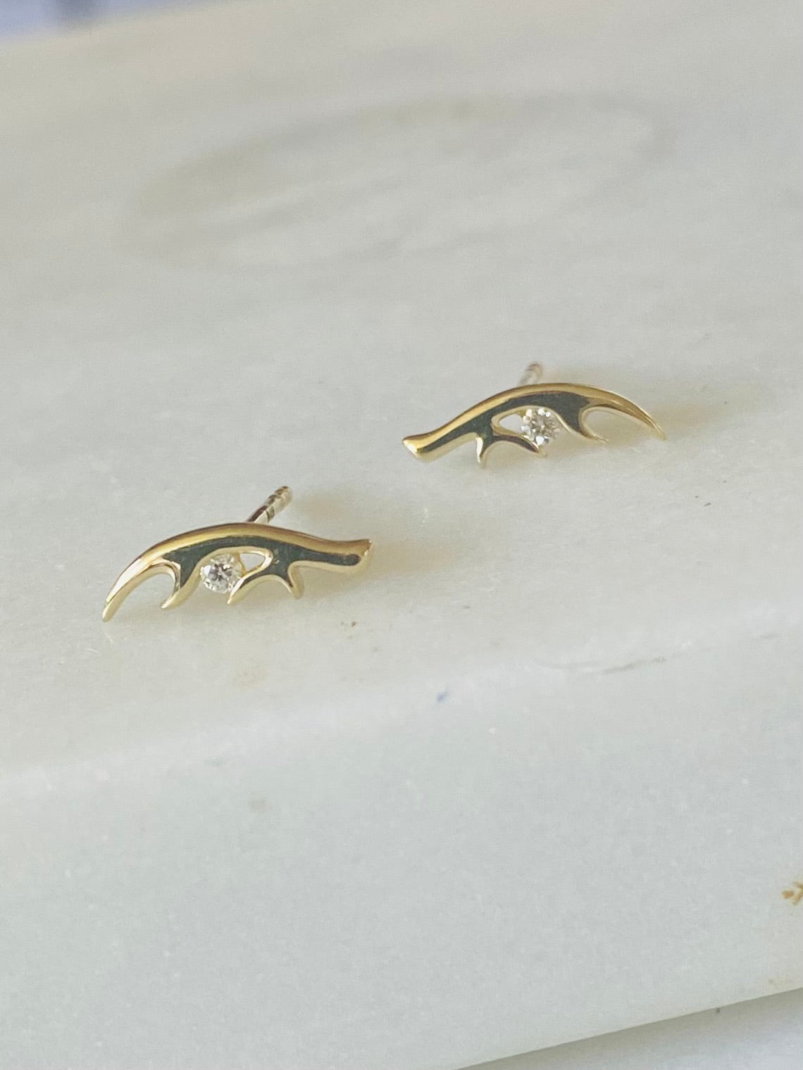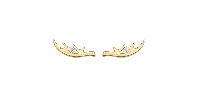Delicately styled antler earrings in 10k yellow gold set with 0.04 carat total weight of genuine natural Canadian mined diamonds.