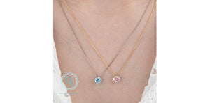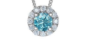 Pink and Blue lab grown diamond pendants with a white diamond halo set in 10k white and yellow gold on a 10k 18" curb chain.