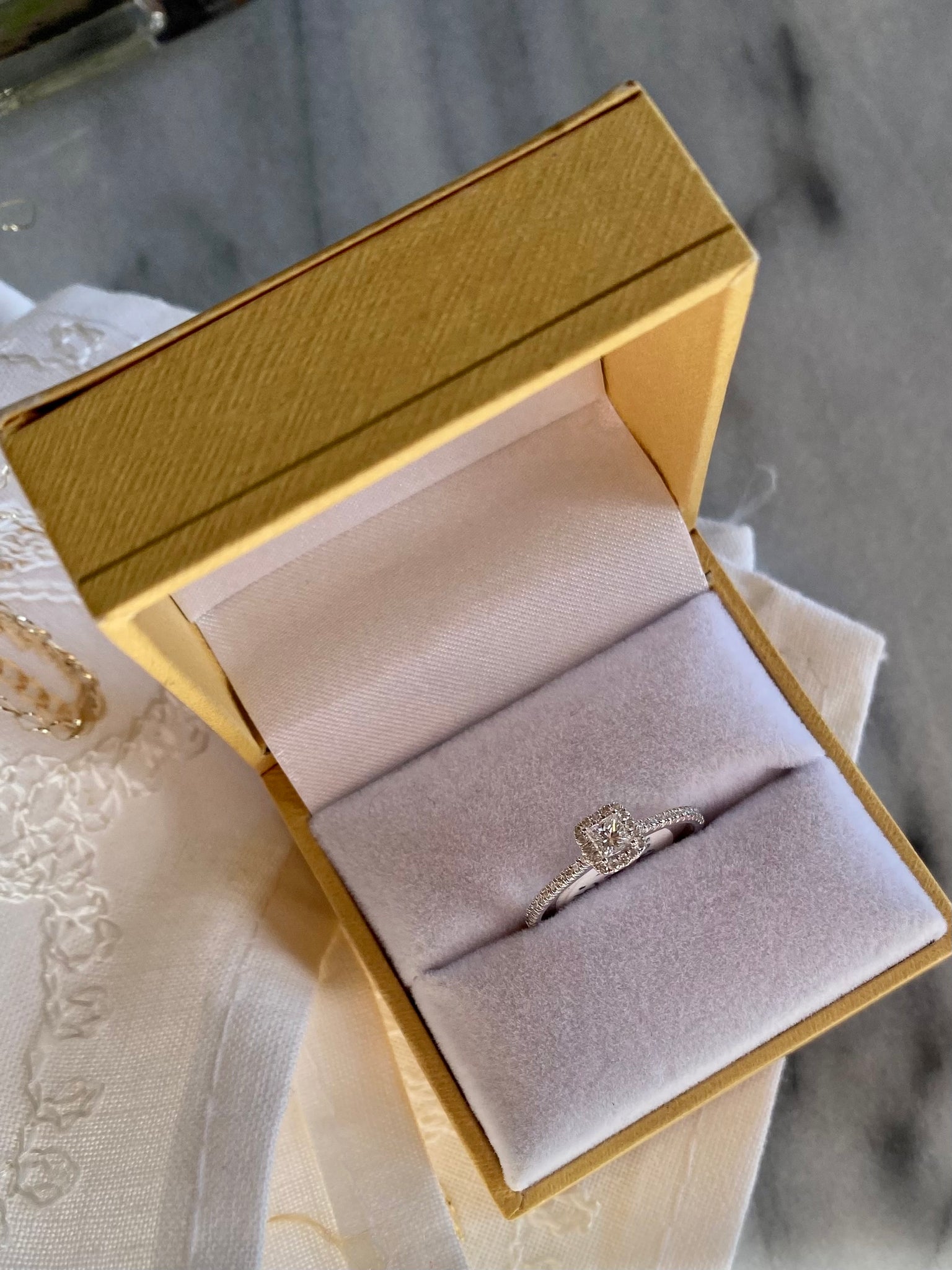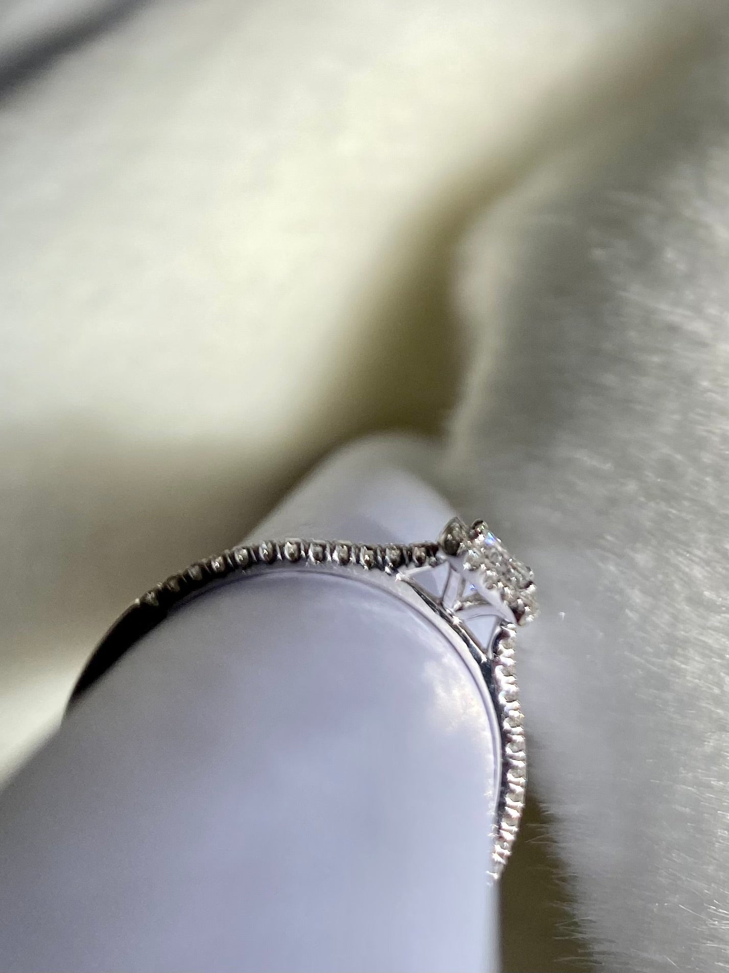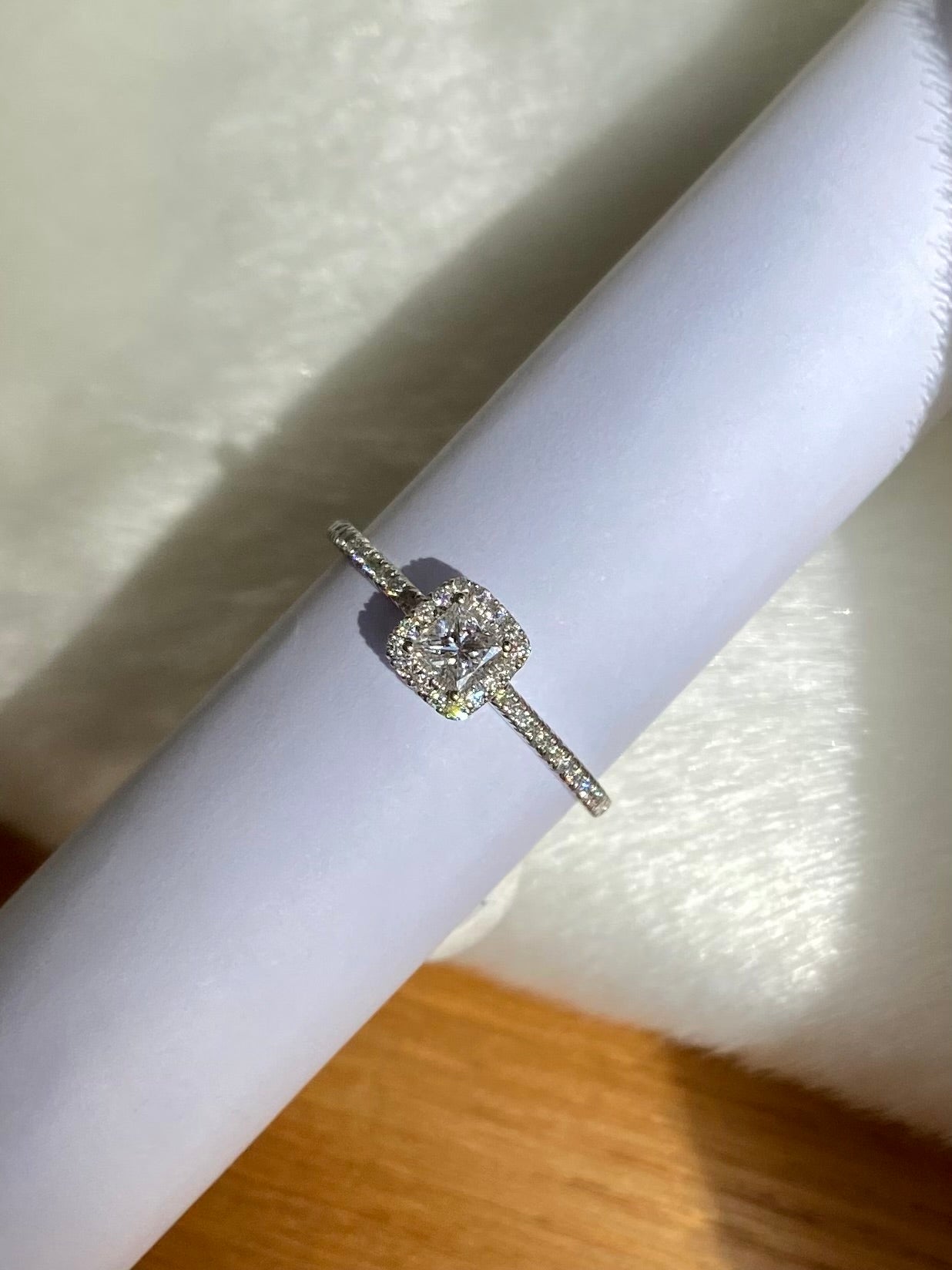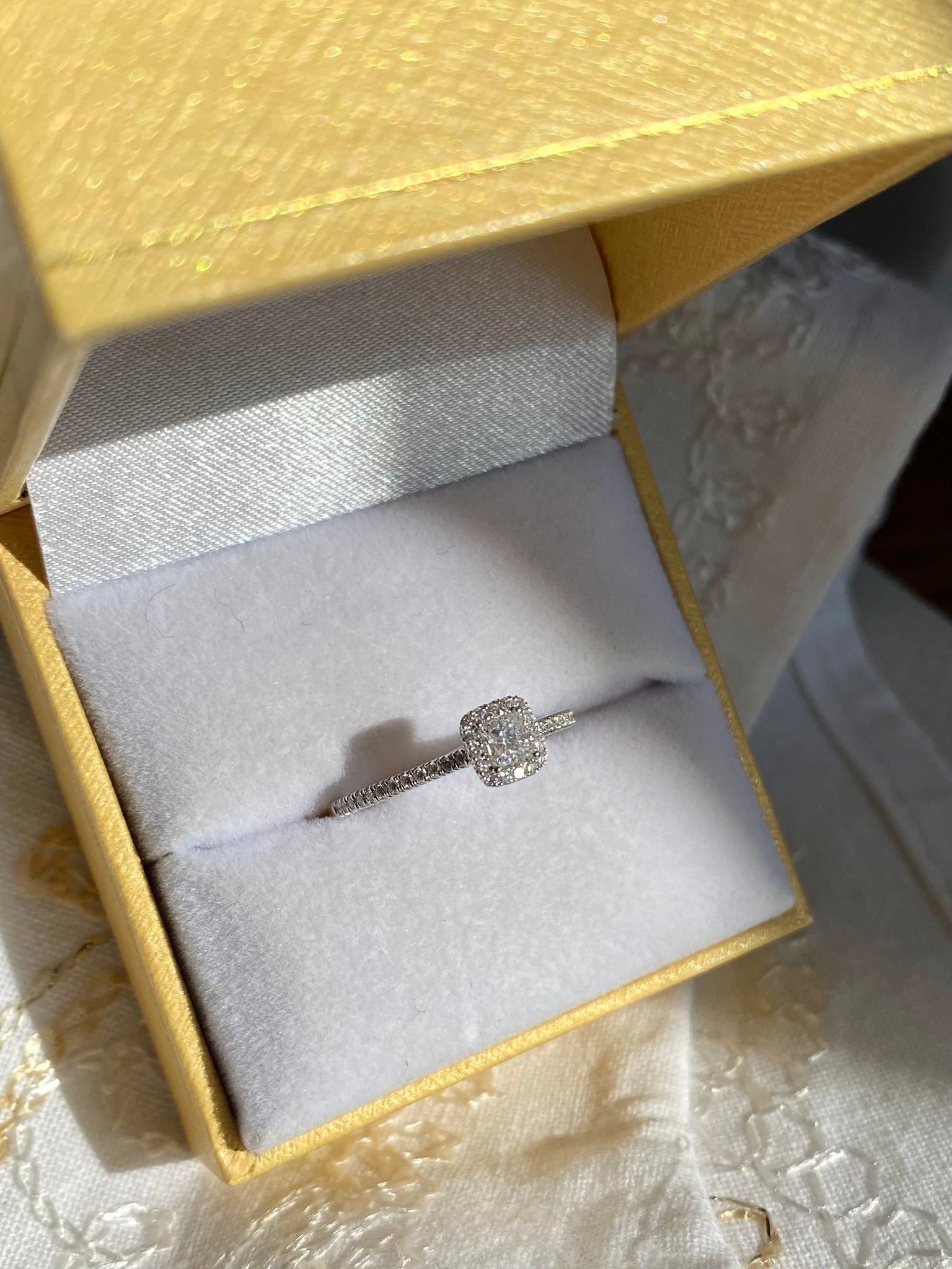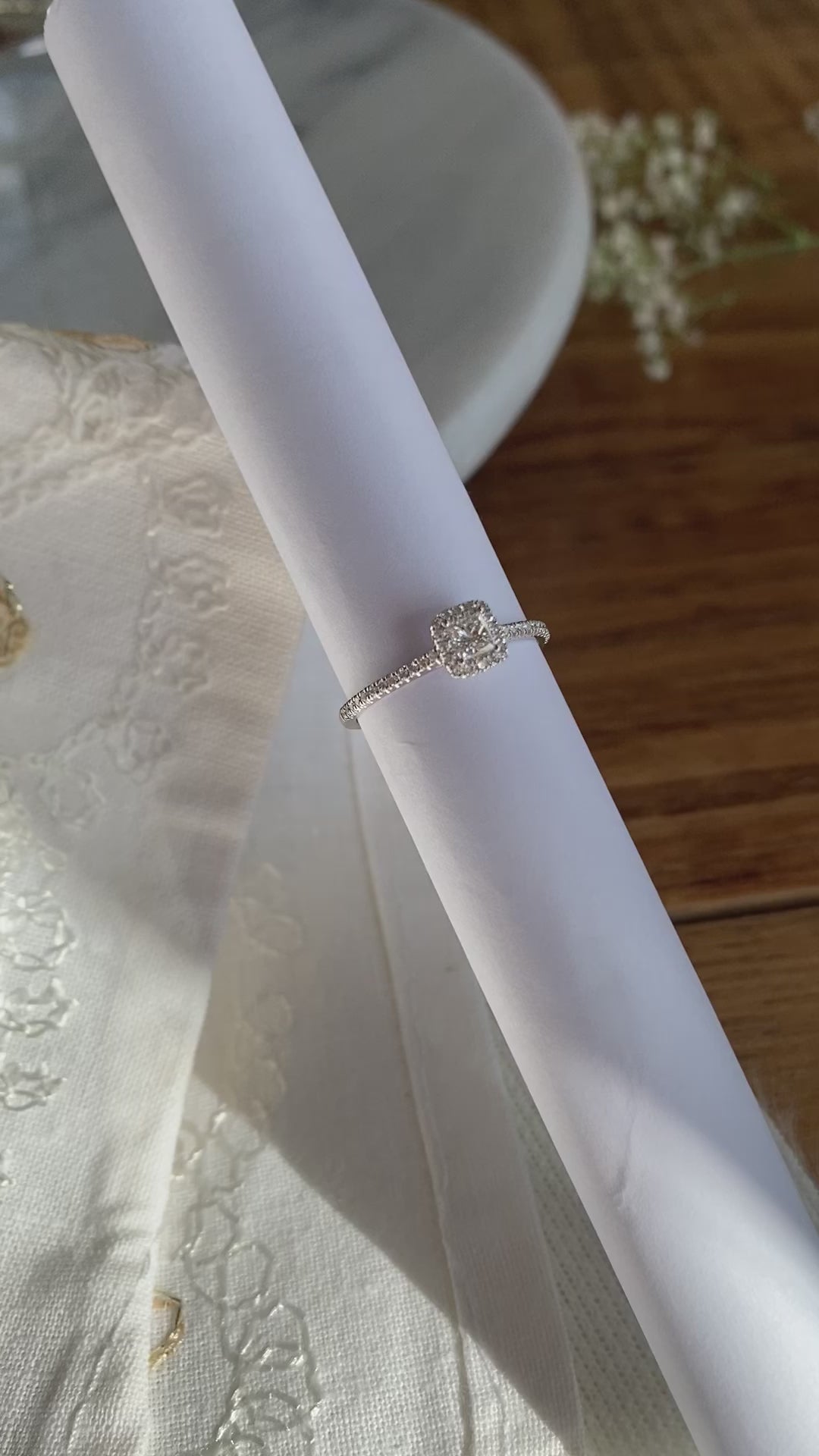 This stunning engagement ring is crafted from 14k white gold and features a .32ct square cut center stone, complemented by a halo of smaller stones and diamond-encrusted shoulders.