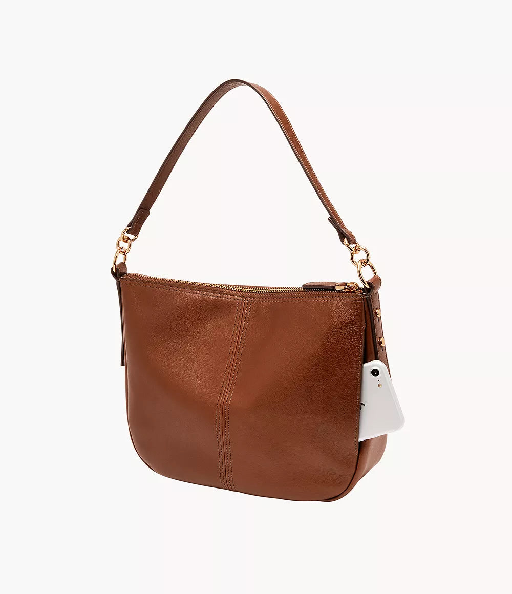 This leather crossbody boasts a hidden side phone pocket and converts into a shoulder bag with a leather shoulder handle and an adjustable, removable crossbody strap.