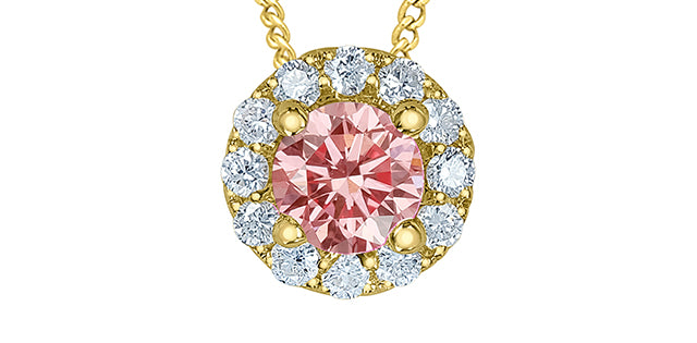 Pink and Blue lab grown diamond pendants with a white diamond halo set in 10k white and yellow gold on a 10k 18" curb chain.